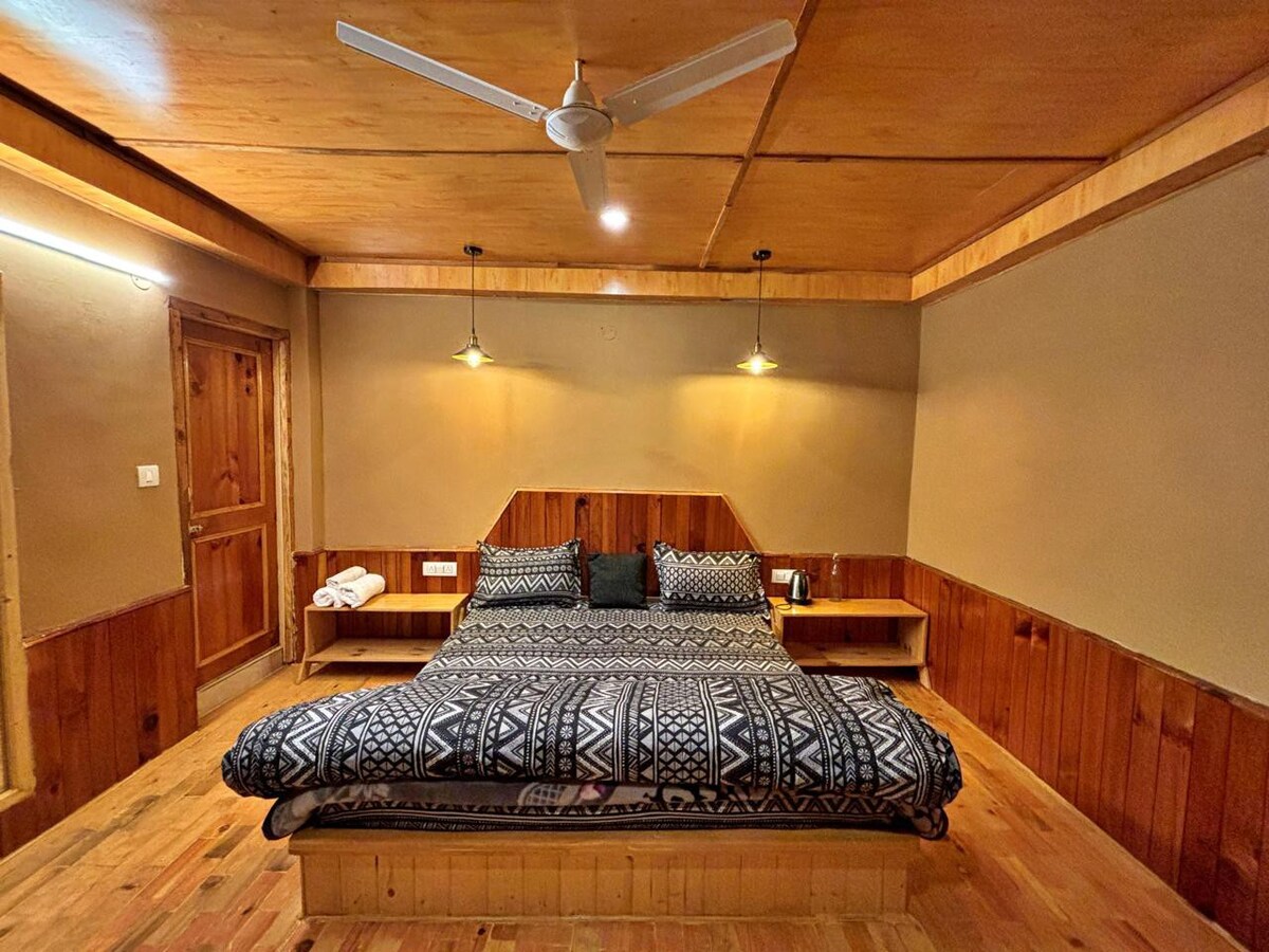 Прокиньтеся в центрі яблуневого саду, загорнутого в гімалайську тишу та золоте світло. У цьому затишному заміському будинку є одна простора спальня з двома ліжками queen-size, тепла вітальня та суміжна ванна кімната. Погляньте на гори через великі скляні панелі, потягуйте каву під деревами та знайдіть спокій у дрібницях. Ідеально підходить для сімей, друзів або тих, хто жадає природи, спокою та магії.