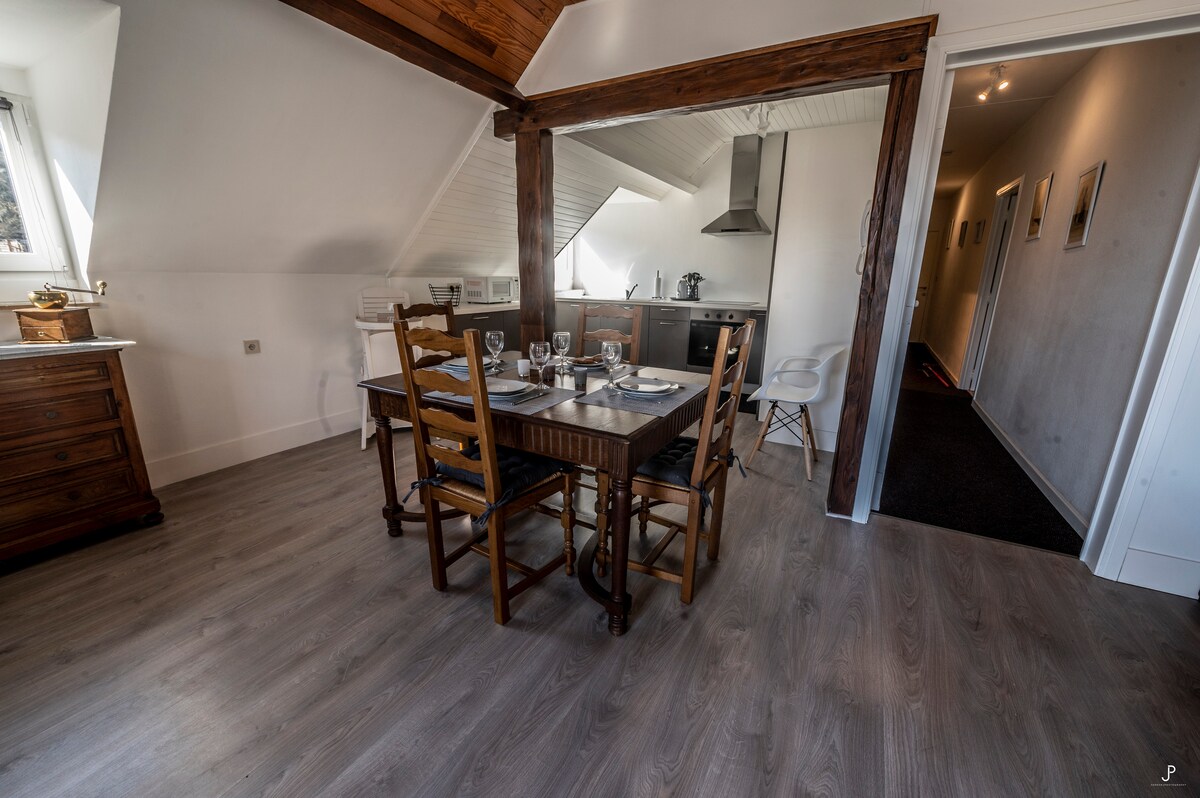 Розташований в центрі Дінанта, приходьте і насолоджуйтеся сніданком, милуючись Цитаделью з балкона. Декогник вміщує до 3 осіб і складається з великої вітальні, ванної кімнати з ванною, повністю обладнаної кухні та спальні з висококласним ліжком queen-size. Переваги: * Залізничний вокзал (50 м). * Парковка (60 м). * Телевізор HDTV (Netflix, Prime Video та Інтернет) * пекарні / ресторани (20 м);