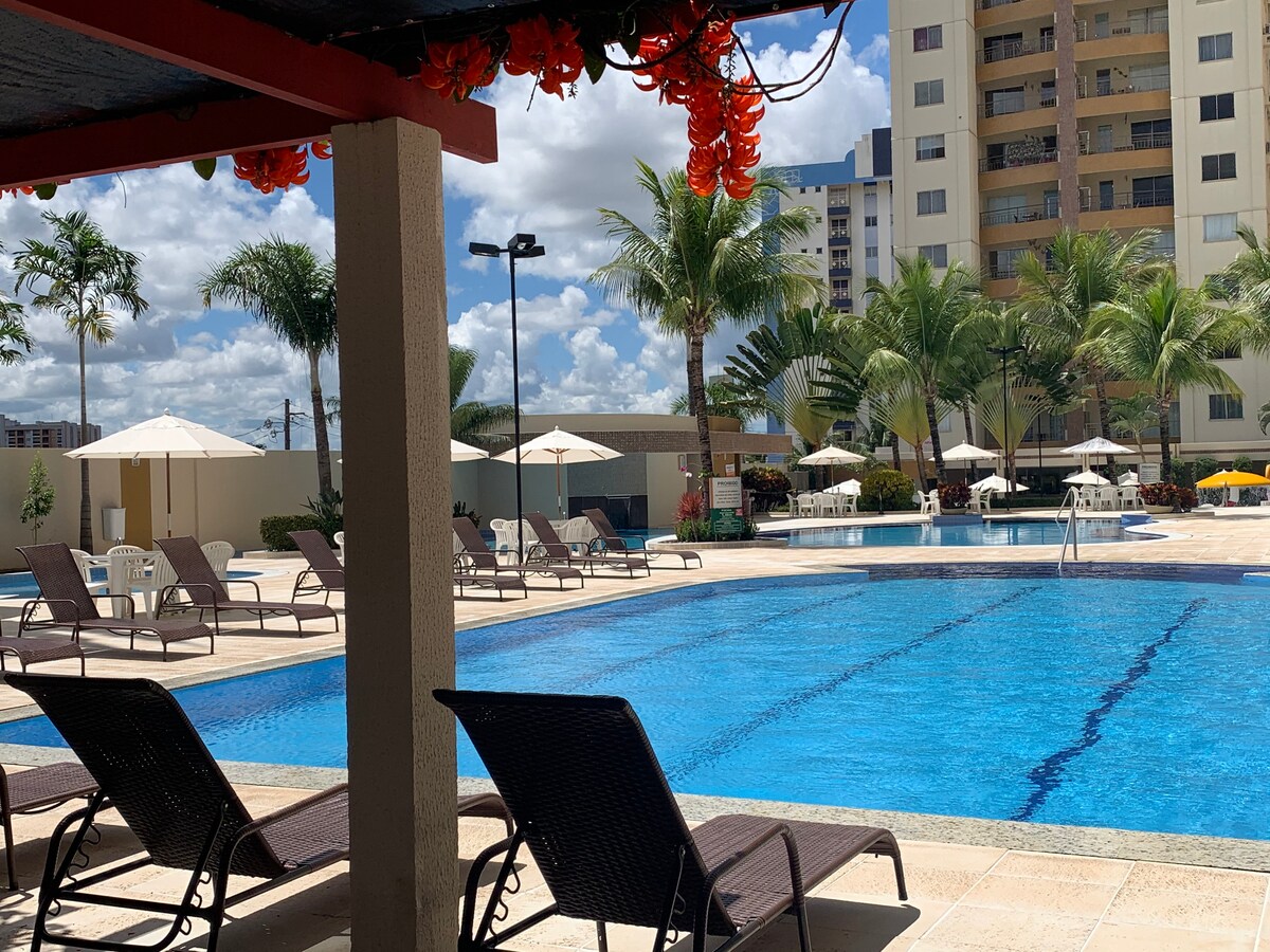 Затишна квартира в повному кондомініумі, з 5 термальними басейнами, сауною та гідромасажною ванною, бар-рестораном, цілодобовою стійкою реєстрації. У квартирі, серед іншого, є смарт-телевізор у вітальні та спальні, портативний кондиціонер 12000 BTU, фен, Wi-Fi 600 Мбіт/с від Claro, повністю обладнана кухня та гамак на балконі. Крите та ексклюзивне паркувальне місце перед ліфтами, а також чудове розташування в Калдас-Новас. Приблизно за 300 метрів від торгового центру Singapore Shopping!