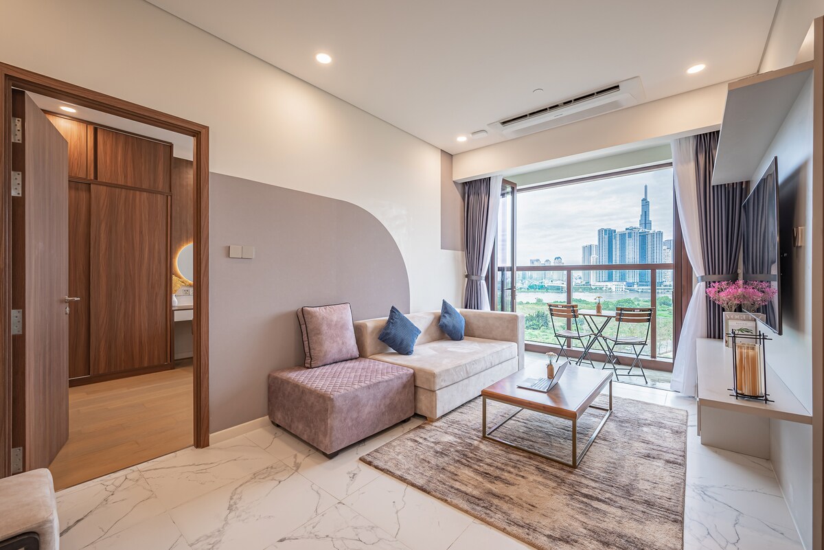 Розкішна 5-зіркова квартира Opera Residence Corner від ChiHome – River View Bason District 1, The LandMark 81, The Galleria, The Mett Office, District 2 Sala Thiso Mall. – Вежа B, Scala, рівень 1x, блок 10 - Розмір: 70 кв. м (кутовий блок) - Включає 2 спальні, 2 ванні кімнати, зручно для 2–4 осіб. - 65-дюймовий телевізор Smart TV із Netflix і YouTube - Диван, крісло, чайний столик. - Обідній стіл на 4 стільці - Повноцінне кухонне приладдя - Високошвидкісний бездротовий Інтернет. • Кондиціонер для всього будинку - Цілодобовий доступ до будівлі