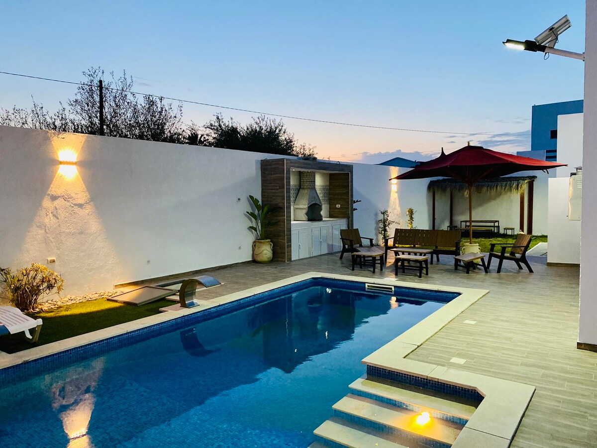 На нашій великій віллі ви знайдете всі необхідні зручності з 10/4 басейном, відпочинок і відпочинок гарантовано! Ідеально розташоване на маячній дорозі між пляжем Сіді-Яті та Мідуном, недалеко від всіх зручностей, центру міста та пляжу. Неподалік від вілли ви знайдете весь необхідний магазин, м 'ясну лавку, пекарню, поштове відділення, мечеть, ресторан, такий як грилі zammouri.
