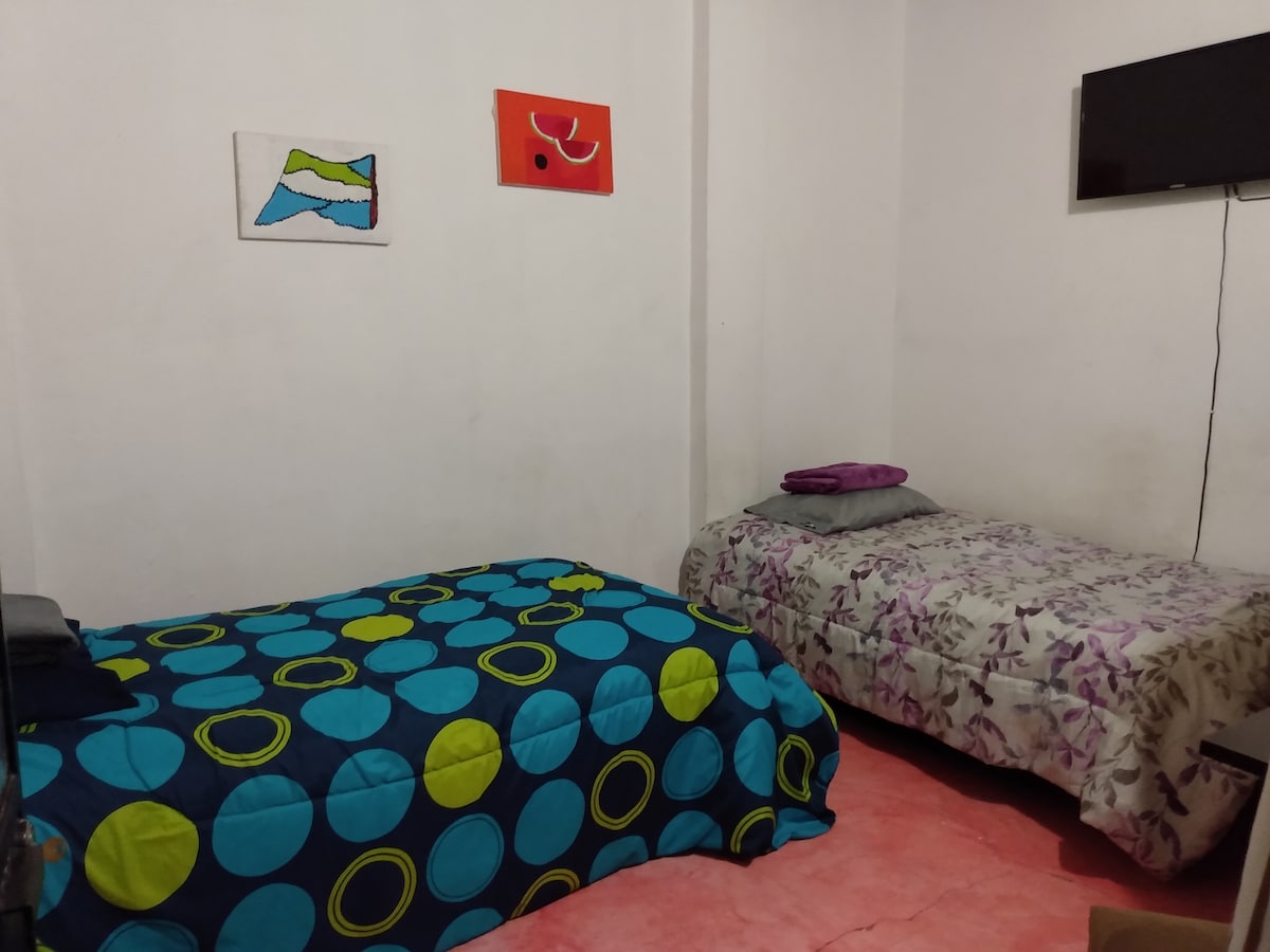 У центрі історичного центру міста Сан-Мігель-де-Альєнде, всього в одному кварталі від головного саду, дуже близько до ресторанів, музеїв, художніх шкіл і супермаркетів, дві затишні кімнати, які ідеально підходять для головної сімейної кімнати з двоспальним ліжком, а друга спальня з двома односпальними ліжками має спільну ванну кімнату з красивим склом і природним освітленням. Помешкання розташоване всередині колоніального будинку на другому поверсі з виходом на терасу, чудове розташування.