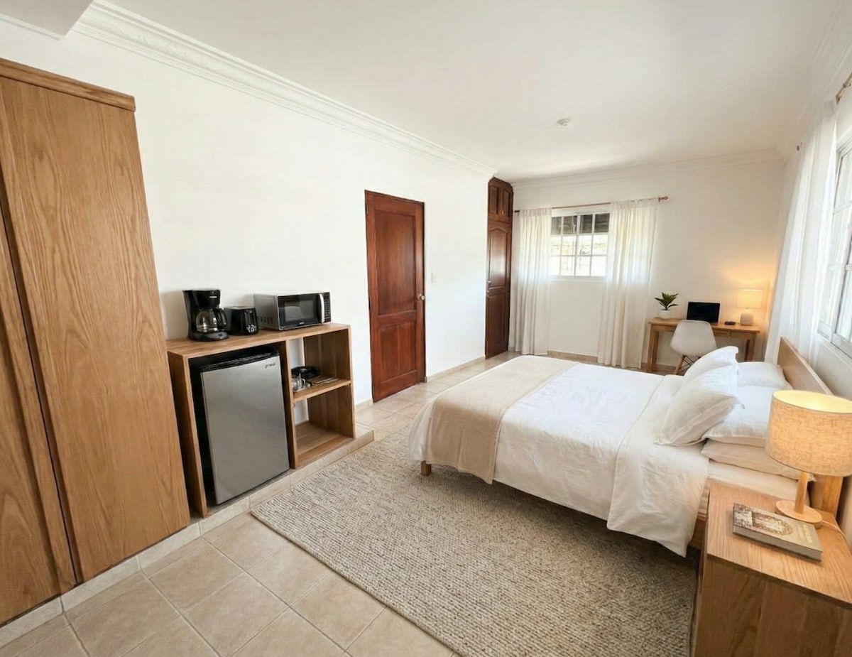 Відпочиньте та відновіть сили в нашому тихому саду Queen Room at Garden by the Sea, бутик-готелі типу «ліжко та сніданок» між Сосуа та Кабарете на північному узбережжі Домініканської Республіки. Простора та комфортабельна кімната з двоспальним ліжком розміру Queen size та диваном-ліжком, що вміщує до 4 гостей. Насолоджуйтеся кондиціонером, Wi-Fi, окремою ванною кімнатою та доступом до басейну та тропічних садів. Ідеально підходить для пар, сімей або друзів, які шукають спокійний бутик-будинок біля пляжів Сосуа та Кабарете.