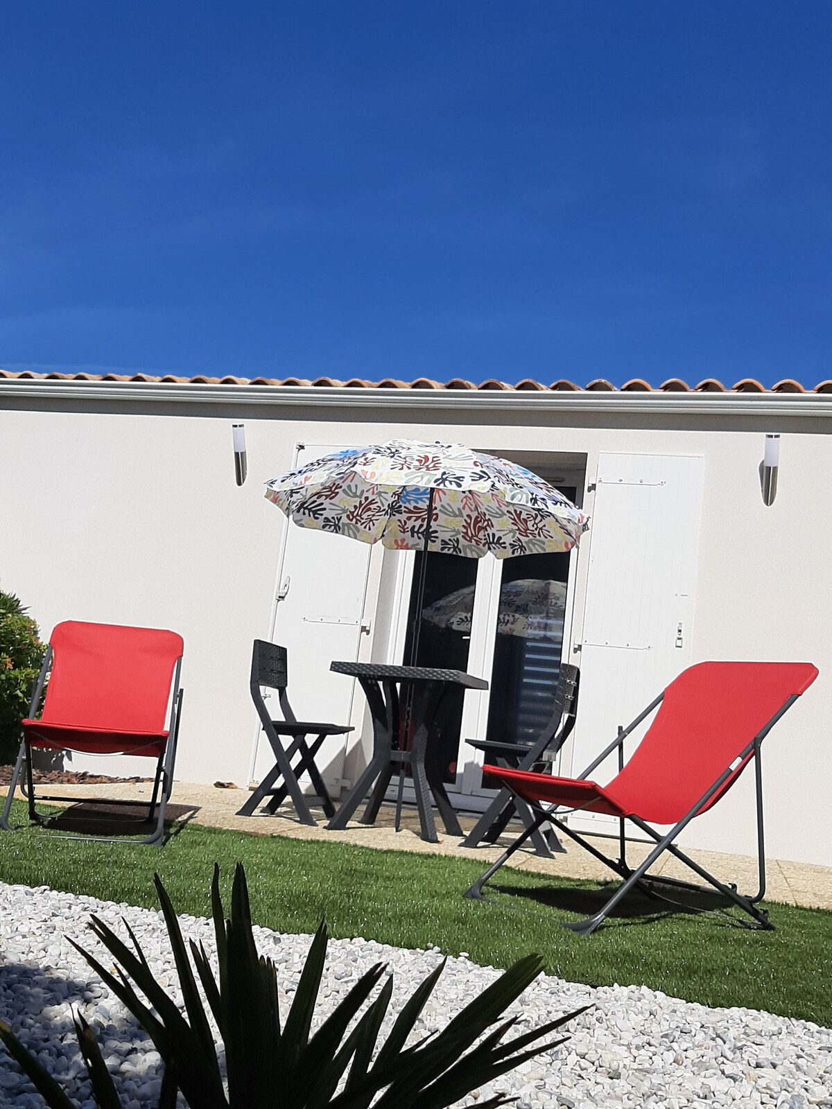 Будинок (класифікований 3 зірки в мебльованому туризмі) площею 45 м² за 6 км від Ла-Рошель біля Іль-де-Ре: на першому поверсі основна кімната, вбудована кухня, вітальня з кабріолетом BZ та туалет. Нагорі спальня з двоспальним ліжком і раковиною, друга спальня з двоярусними ліжками (включаючи запас простирадл) та ванна кімната з душем та раковиною . За запитом є дитяче ліжечко та високий стілець. Навпроти будинку сад площею 60 м² з терасою: садовими меблями та барбекю.