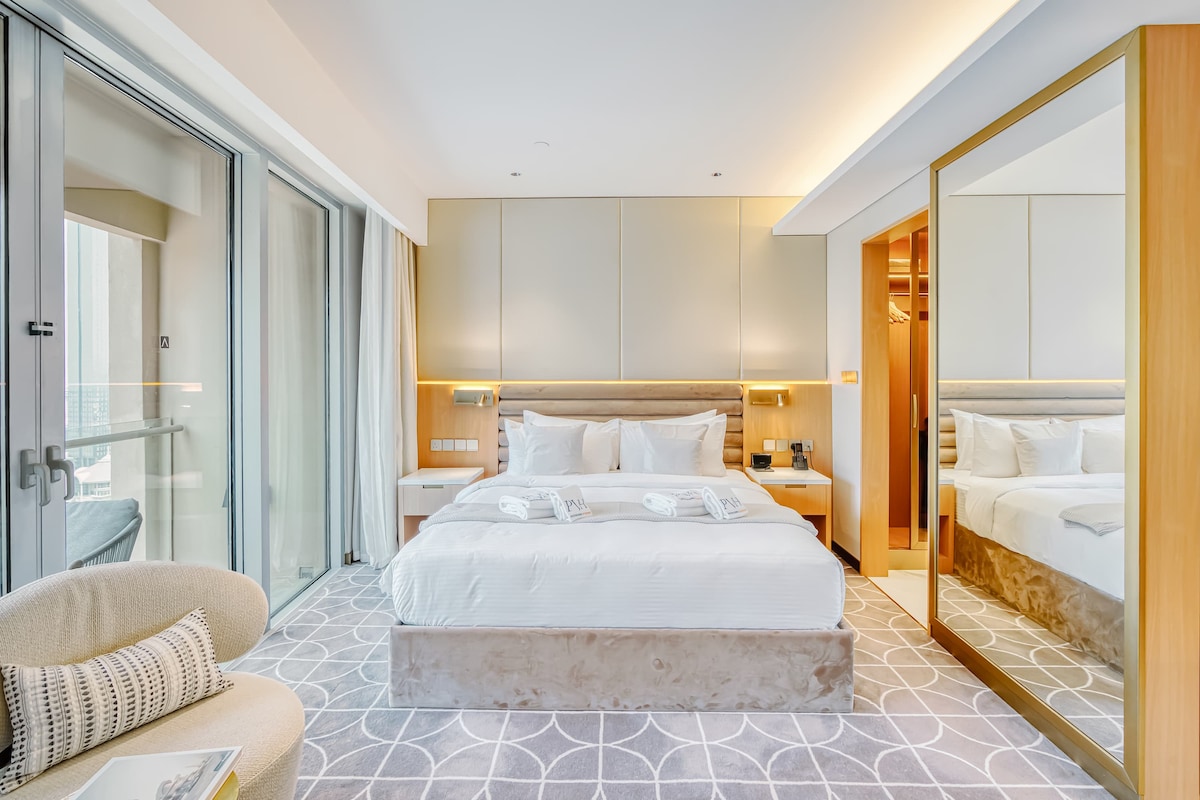 Елегантна студія в культовій вежі SLS, Бізнес-Бей. Насолоджуйтеся ліжком розміру king size, затишною вітальнею, смарт-телевізором, високошвидкісним Wi-Fi та повністю обладнаною міні-кухнею. Відпочиньте на балконі з панорамним видом на місто або розслабтеся у двох безкрайньких басейнах на даху. Зручності включають сучасний тренажерний зал, розкішний спа-центр, ресторани, цілодобову консьєрж-службу та паркувальника. Всього за 5 хвилин від центру міста, торгового центру Дубай Молл і Дубайського каналу, ідеально підходить для пар, бізнес-мандрівників або гостей, які шукають підвищеного комфорту з неперевершеною зручністю.