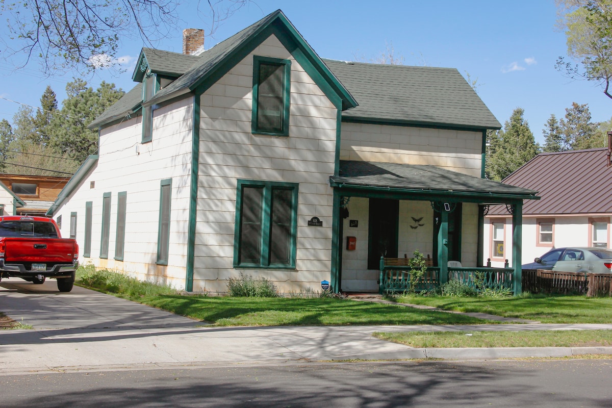 Довоєнне бунгало з 2 спальнями та 2 ванними кімнатами на західному краю історичного центру Флагстаффа, маршрут 66, 1/2 милі до продуктового магазину Баші (10 хвилин ходьби), NAU 3/4 милі (15 хвилин ходьби) до NAU та медичного центру Flagstaff. Шейкерні шафи, гранітні стільниці, вишнево-червоні прилади. Повністю огороджений двір із барбекю на вугіллі, столом для пікніка, стільцями Adirondack та місцем для багаття. Смарт-телевізори у вітальні та спальнях зі швидким потоковим Wi-Fi. Повнорозмірна пральна/сушильна машина. Парковка для одного автомобіля поруч із будинком.
