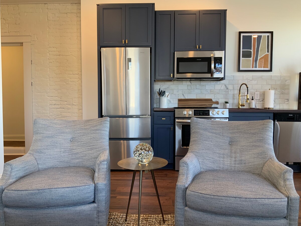 Відчуйте стиль Луїсвілля в цій висококласної квартирі, яка ідеально підходить для 4 гостей. Спокійно виспіться на м’якому ліжку розміру king size з ефектом пам’яті або на дивані розміру queen size з ефектом пам’яті, а потім почніть свій ранок з безкоштовної кави. Виходьте на вулицю, щоб дістатися пішки до ресторанів, розважальних закладів і 4th St. Live! Відпочиньте, погравши у віртуальний гольф, відвідавши цілодобовий тренажерний зал або влаштувавши кіновечір із Hulu та Disney+. Комфорт, зручність і справжні враження від міста. Забронюйте своє перебування у нас сьогодні!