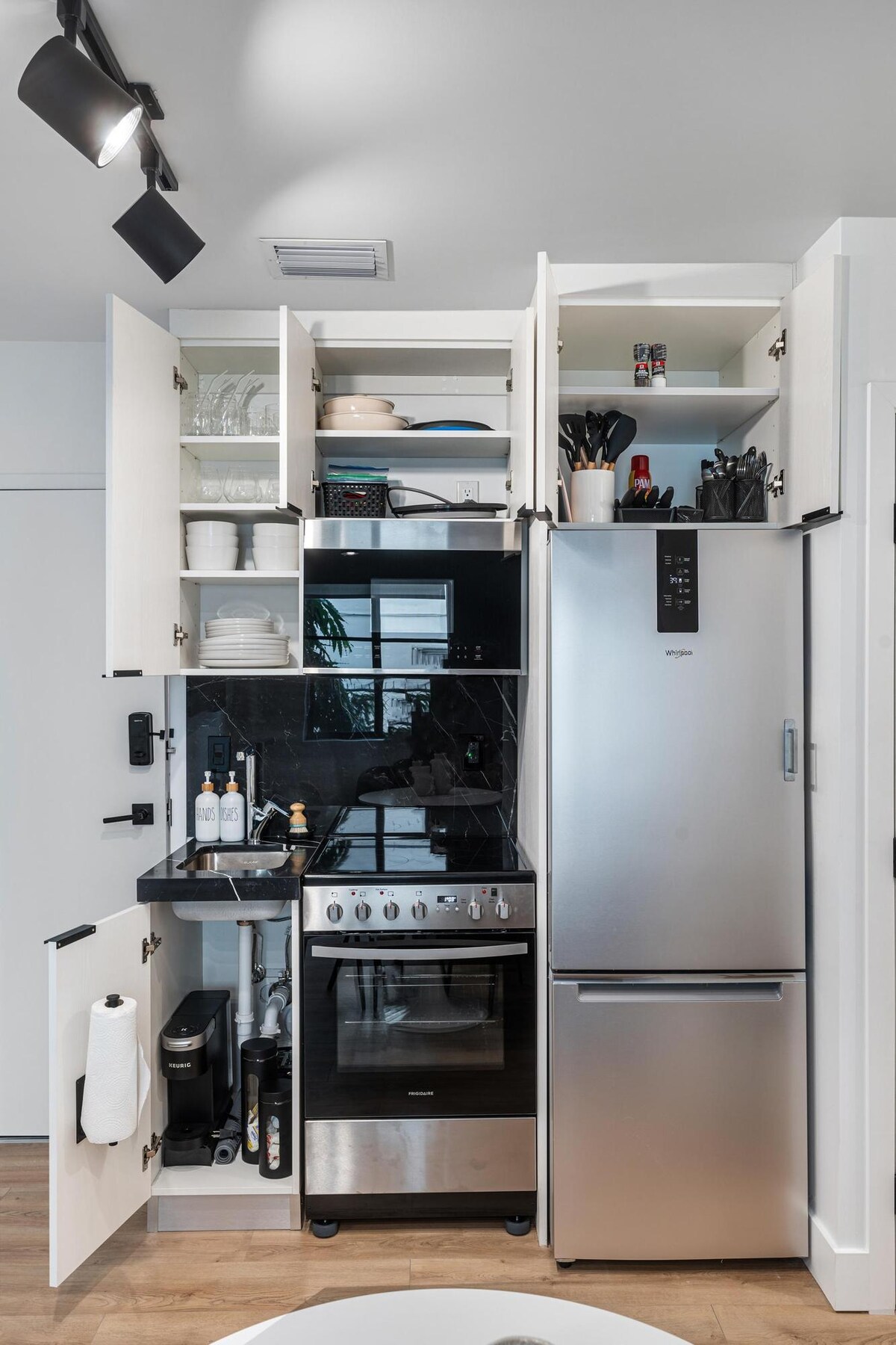 Відремонтований, просторий і світлий люкс-студія на березі океану на Оушен Драйв, Саут-Біч 🏖️ Включає всі зручності, постільну білизну, рушники, мило, швидкий Wi-Fi, Smart TV 55”, тихий кондиціонер Aire Split; ПОВНОСТЮ ОБЛАДНАНУ КУХНЮ: весь посуд, посуд та аксесуари 🍝 2 окремі ліжка queen-size зі стильною шторкою для усамітнення 💤 Крита парковка 10 м і в кондомініумі за попереднім бронюванням🚗 1 хв. від екзотичної авеню: Лінкольн-роуд, Спейн-вей, Коллінз, Вашингтон, lCasa Versace та Deco Hotels Restaurants Bars