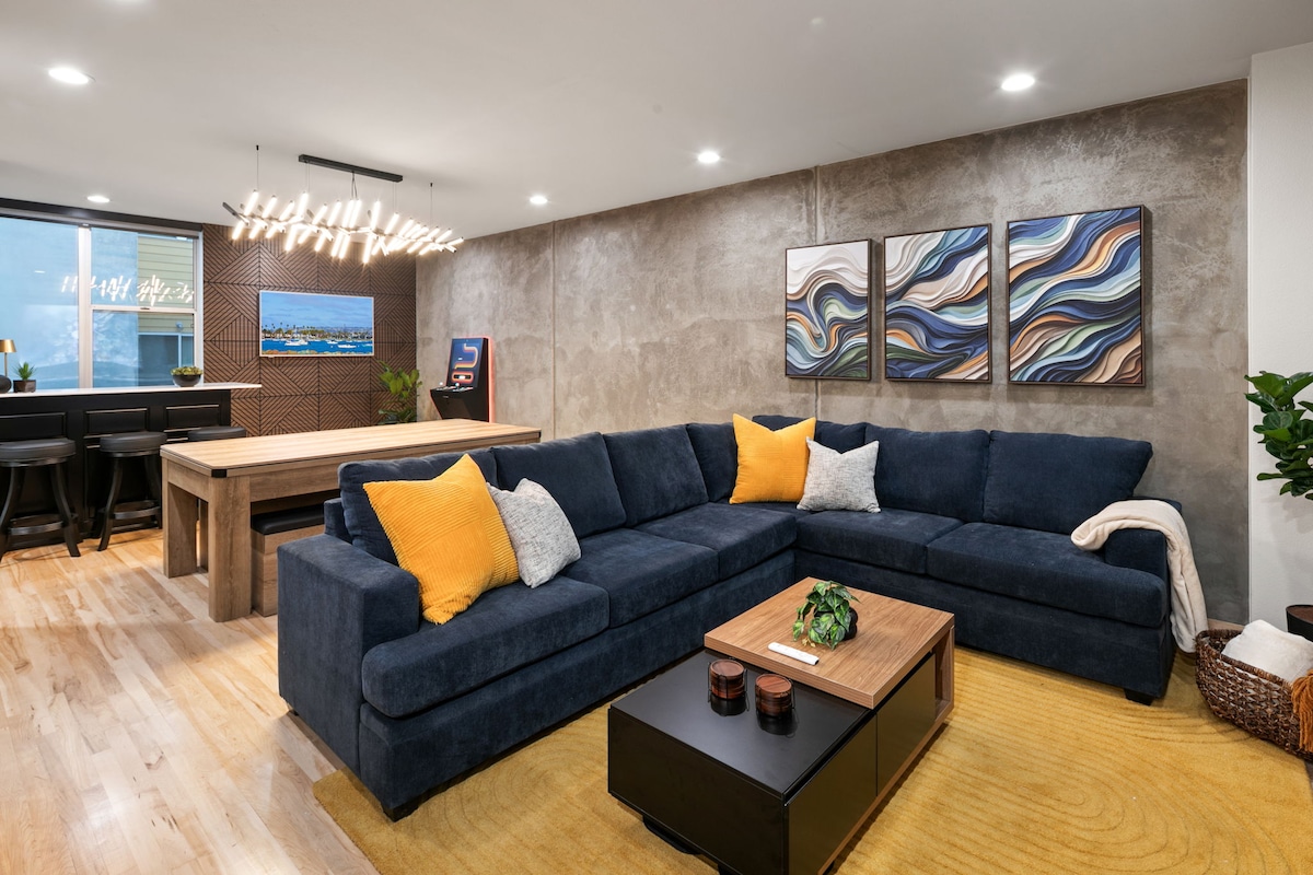 Ласкаво просимо до The Row House, вашого розкішного триповерхового міського помешкання в центрі Іст-Вілледж. Насолоджуйтесь приватною терасою з гідромасажною ванною, інфрачервоною сауною, домашнім тренажерним залом, трьома спальнями з двоспальними ліжками розміру "king-size", Wi-Fi зі швидкістю 400 Мбіт/с, повністю обладнаною кухнею, гаражем та численними розважальними зонами — і все це в пішій доступності від парку Петко, Газового ліфта, Сіпорт-Віллідж та найкращих ресторанів Сан-Дієго.
