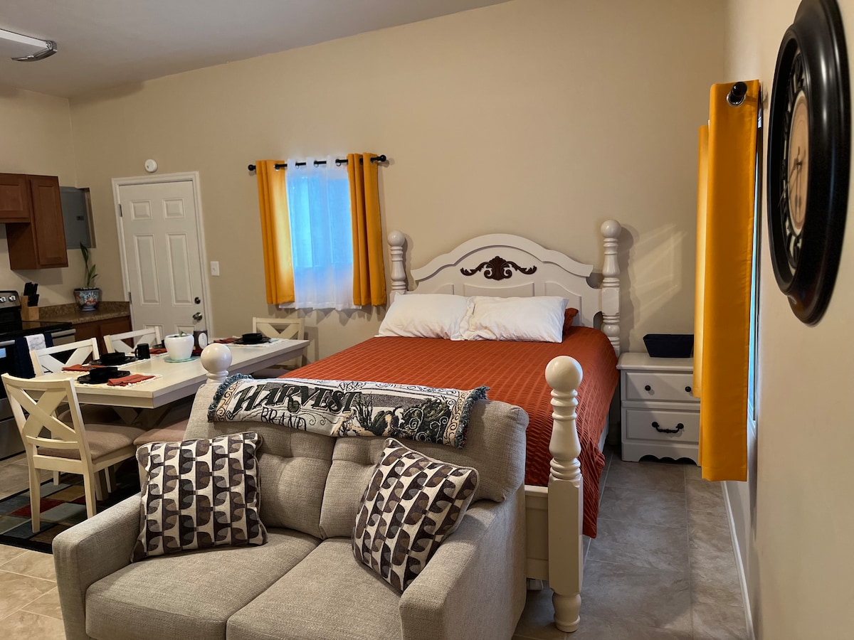 Cozy up in this remodeled studio on a beautiful 17-acre property in West Tucson Foothills. Part of an older 5-plex with 8 other houses, this charming unit features a king bed, common heating (kept around 70°F in winter), AC/heater mini split, small kitchen with microwave and stove/oven, Roku TV, and fast WiFi (~400 Mbps). ~350 sq ft of comfort with a beach-themed décor. Very clean, with lots of beach vibes—but no ocean. :) AZ TPT Lic 21337578