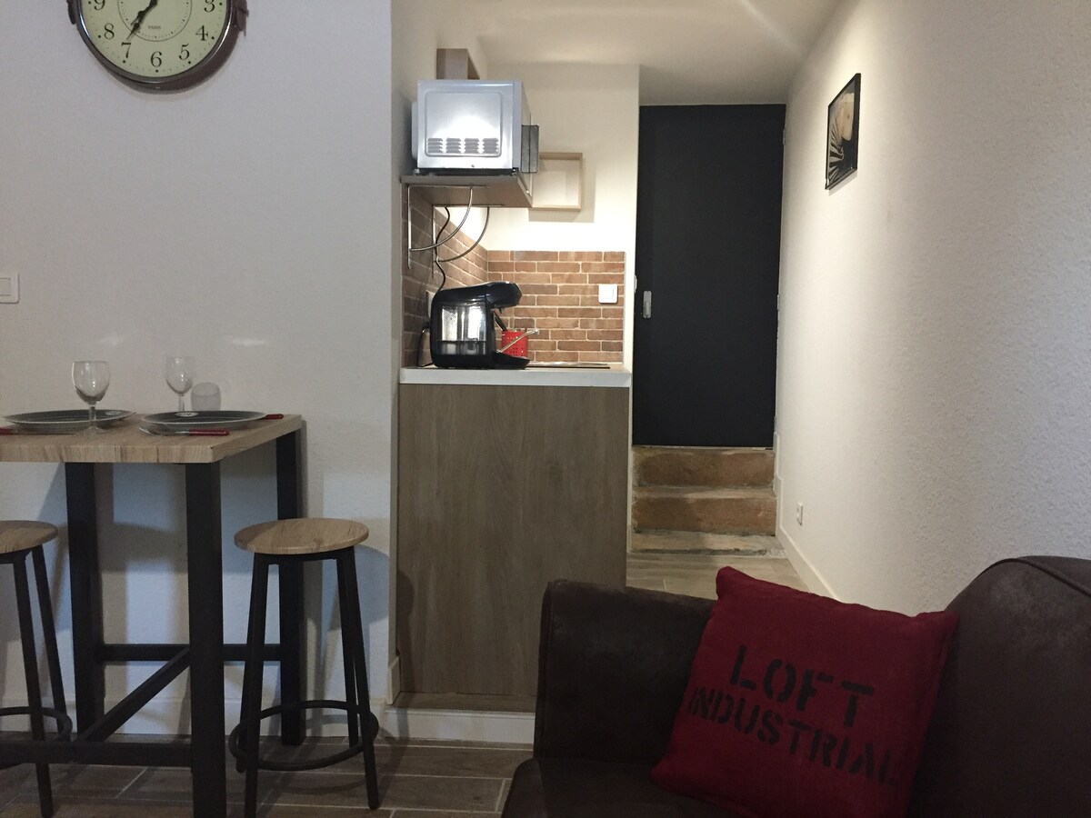 Насолоджуйтеся елегантною, світлою та функціональною квартирою в центрі міста. Ця квартира розташована на другому поверсі старого будинку, має центральну кімнату (спальню, вітальню, кухню) та велику ванну кімнату з туалетом в алькові. Ліжко нове, вся квартира була нещодавно відремонтована. З вікон відкривається прекрасний вид на вулицю, яка веде до собору в центрі житлового району, звідки відкривається прекрасний вид на Круа-де-Жустін.