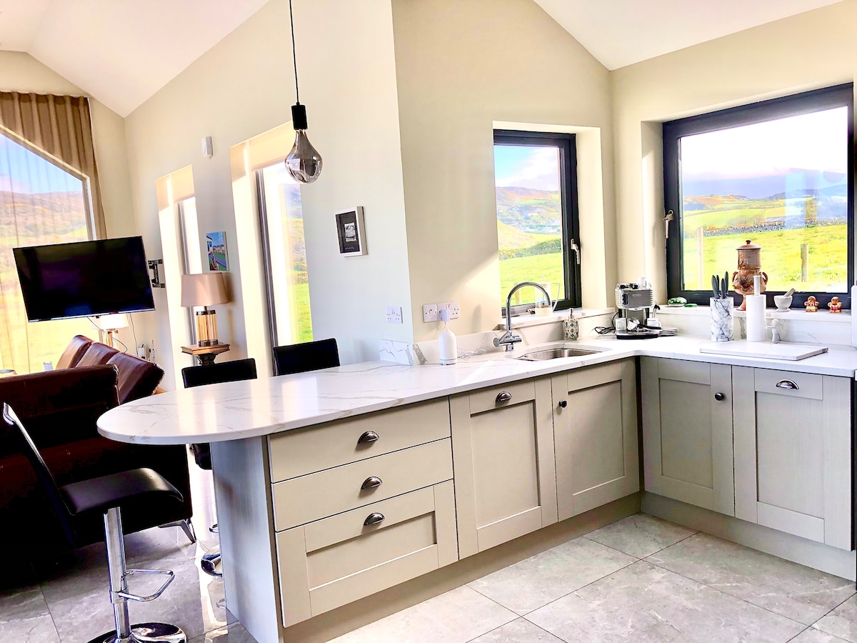 Розслабтеся в нашому автентичному зрубі відкритого планування. Приходьте відпочити, розслабитися та розслабитися в центрі Gonegal Gaeltacht. Насолоджуйтеся приголомшливим видом на гори Севен-Сістер, відпочиваючи в гідромасажній ванні, халатах і тапочках. Всього в 3 хвилинах їзди від пляжу Магероарті, де ви можете скористатися екскурсіями по острову та поромними сполученнями до місцевих островів. Національний парк Гленві, гори Еррігал і Мучіш, лісопарк Ардс і винокурня Croilthlí знаходяться в 30 хвилинах їзди.