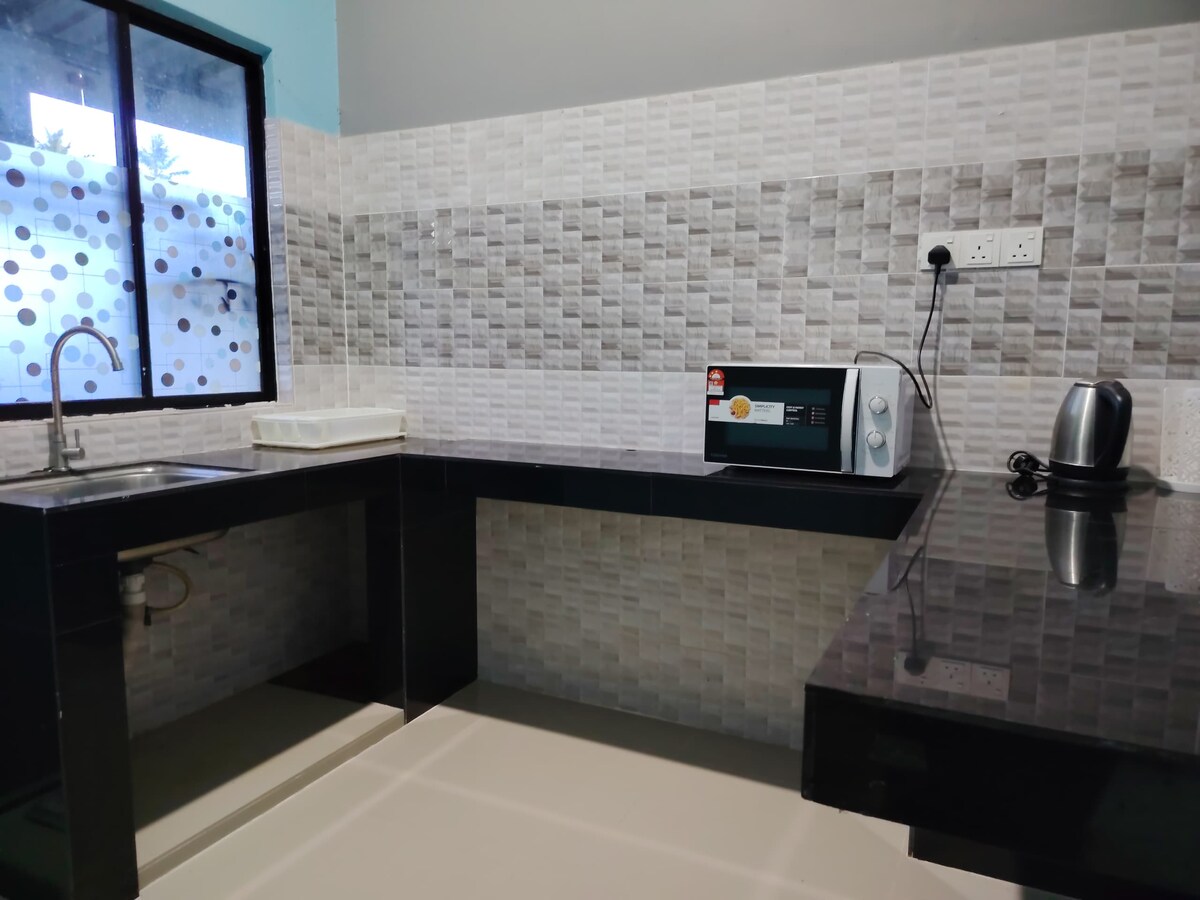 AZA HOMESTAY DUNGUN Кімната: 1 кімната Ліжка: 1 ліжко king-size і 1 супер односпальне ліжко Туалет: 1 унітаз Прибуття: 15:00 Виїзд: 12:00 Гаразд: 1. Кондиціонер 2. Astro 3. Sterica & sterica board 4. Чашка для ложки 5. Нагрівач питної води 6. Душовий водонагрівач 7. Мило для шампуню для ванни 8. Телевізор 9. Холодильник 10. Пральна машина 11. Безкоштовний і достатній просторий паркінг. Дуже стратегічний район: - 3 хвилини до пляжу Дунгун. - 5 хвилин до UITM DUNGUN. - 5 хвилин до міста Дунгун. - 10 хвилин до політехніки Дунгун; - 10 хвилин до причалу острова Тенггол;