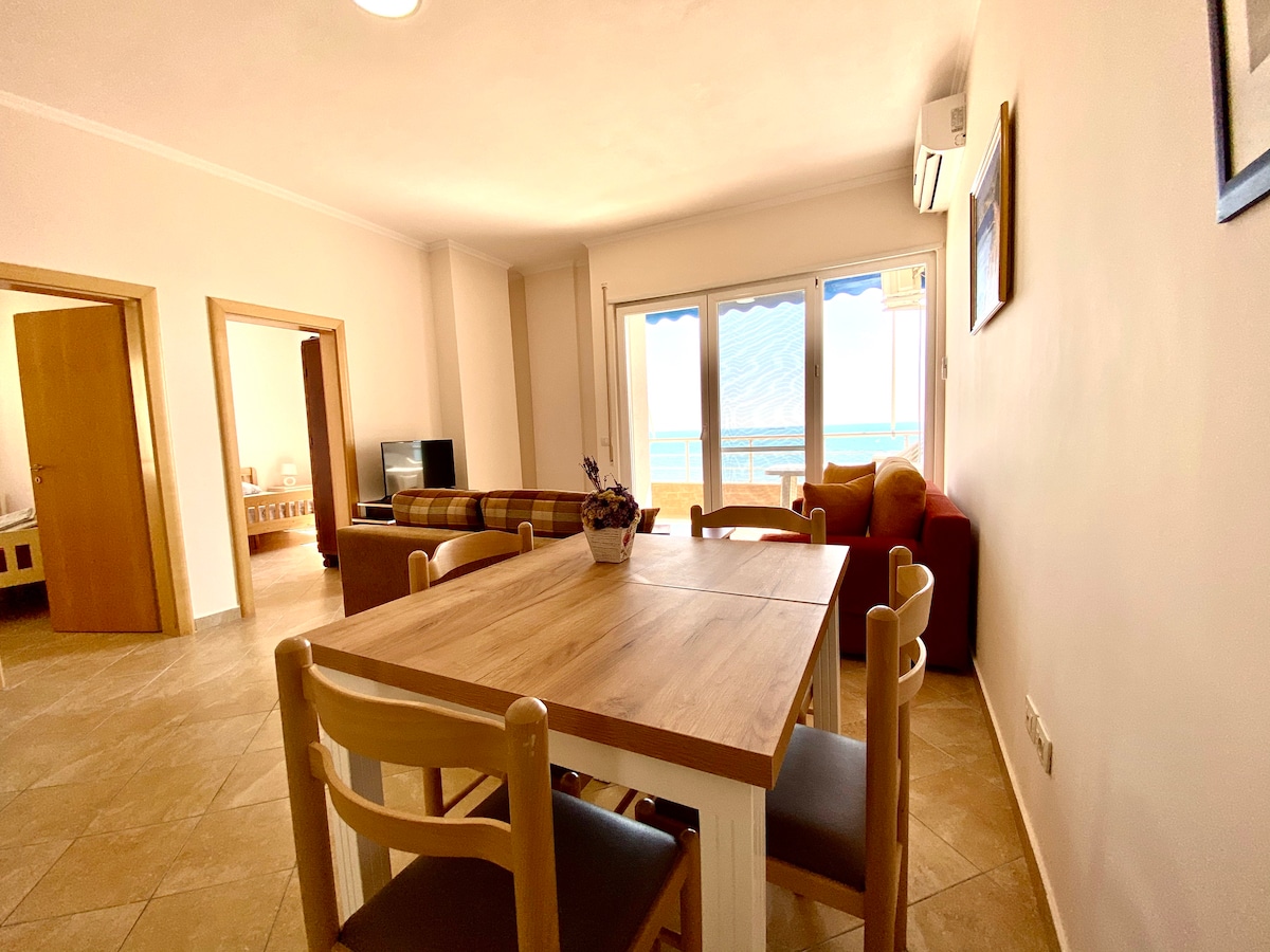 Spacious apartment (140 m2) directly to the beach, where you can feel and hear the waves from your apartment. With a spectacular view this apartment is located on the most popular area on Durresi Beach. The maximum capacity is for 7 people; Living room, two bedrooms, two bathrooms and two balconies. - Room 1 - Double bed and one single bed. - Room 2 - Two single beds. - Living room - with big sofas is good for 2 people. Very comfortable for long stays. Sincerely your SuperHost Armando 😇
