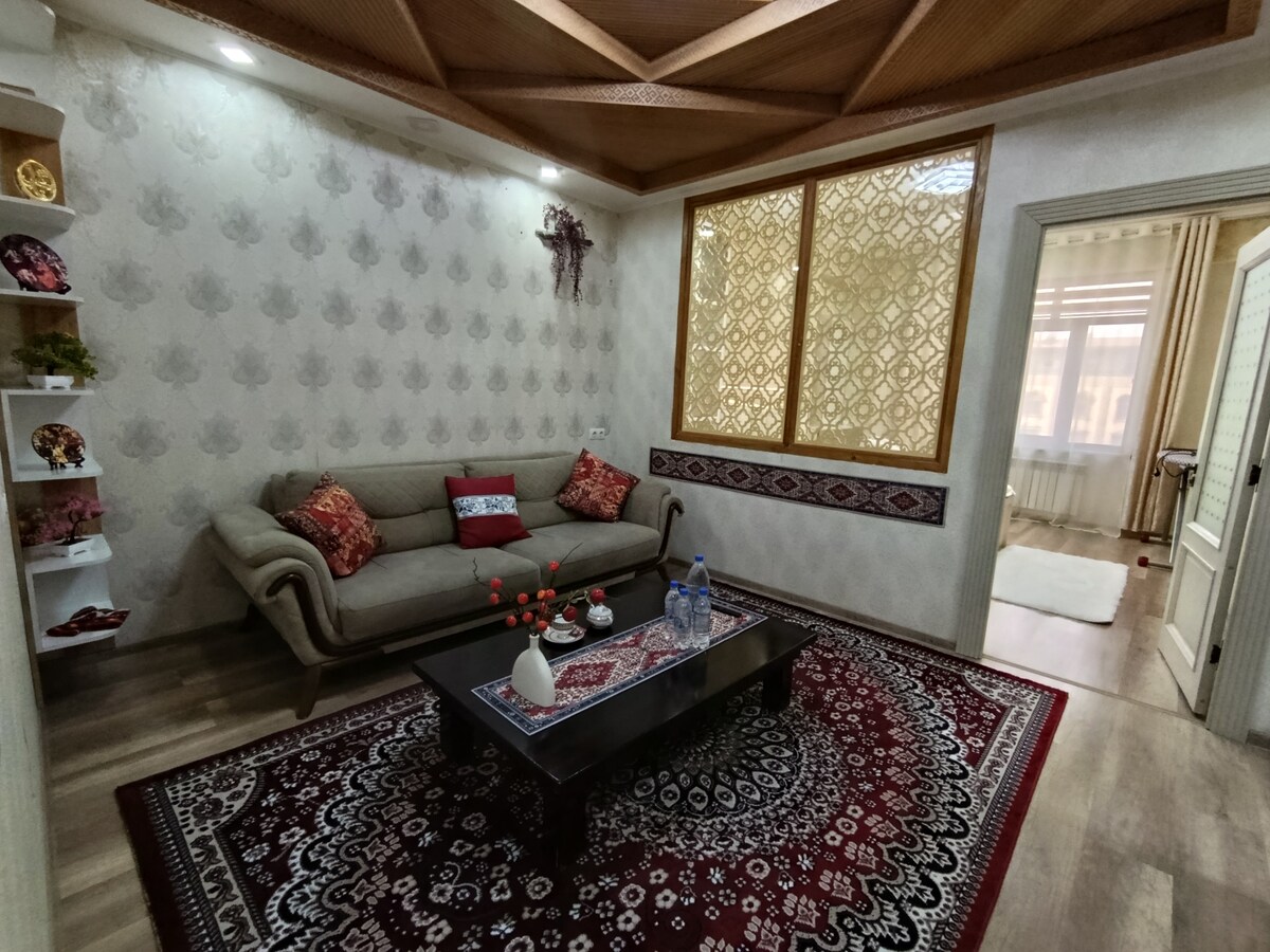 Простора(91 кв. м) 1 СПАЛЬНЯ з великою кімнатою, розташованою в центрі абсолютно нового житлового житлового комплексу в центрі міста. Легко дістатися до основних пам 'яток міста. Мацца (Мазза) Кав 'ярня з повним меню на першому поверсі. Пішки до ринку Mehrgon Market(1 км), ресторану Sultanbey(1,2 км), парку Рудакі/Національного музею(1 км), площі Оперного балету (2,1 км) та близькості до інших центральних пам 'яток.