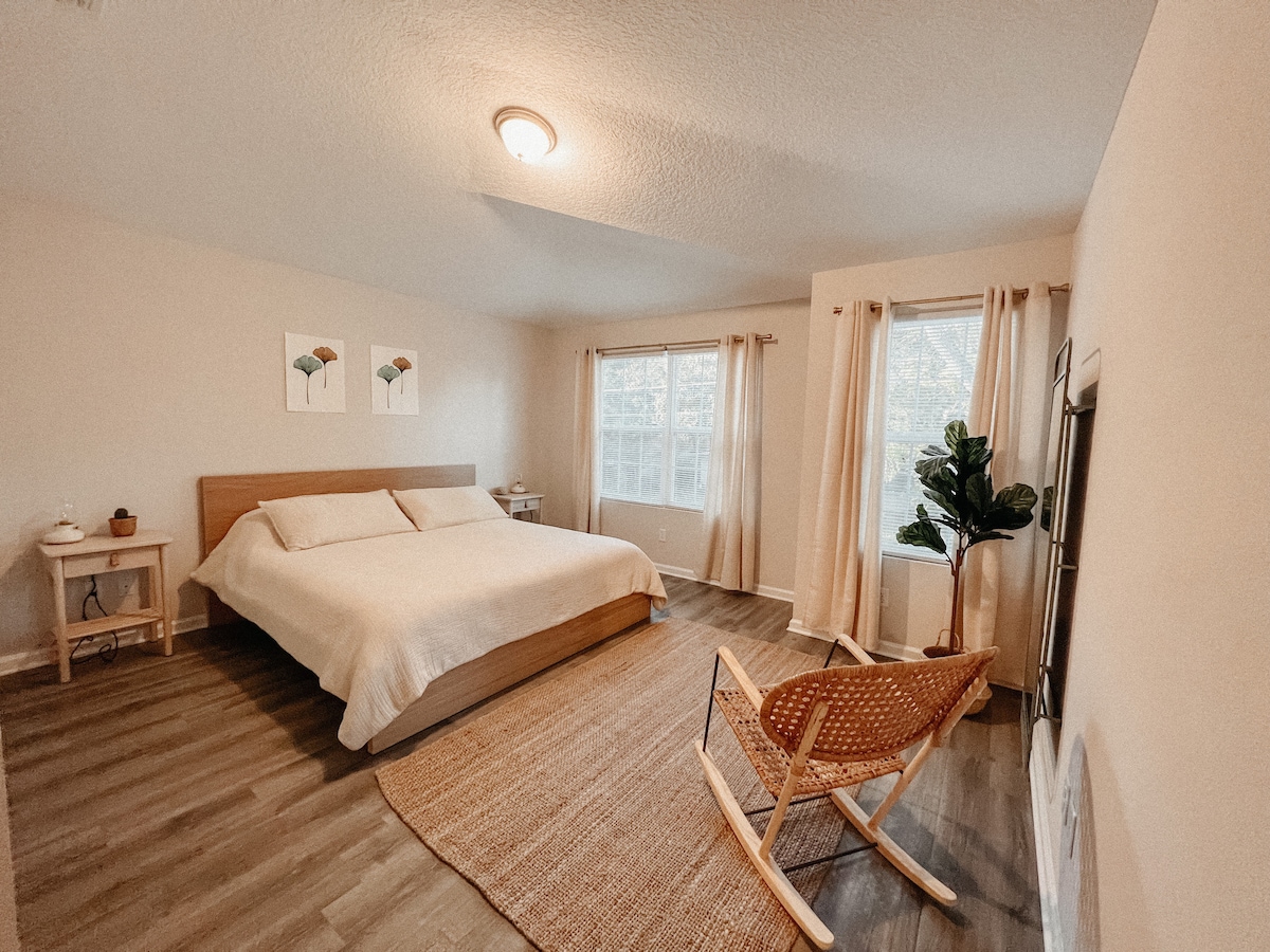 Це чарівне бунгало розташоване в центрі пішохідного району Ріверсайд — найвеселішого району Джексонвіля. Насолоджуйтеся ліжком розміру «king-size», розумними динаміками, швидким Wi-Fi та потоковими каналами, а також повністю укомплектованою кухнею та заднім двором зі стільцями Adirondack, електричним грилем, місцем для багаття та навіть наборами для смаження. Скористайтеся нашим індивідуальним порадником, щоб дізнатися про місцеві магазини та ресторани, які можна відвідати на наших круїзних велосипедах (з підсклянниками та тримачами для мобільних телефонів). Також є приватна парковка на проїзді.