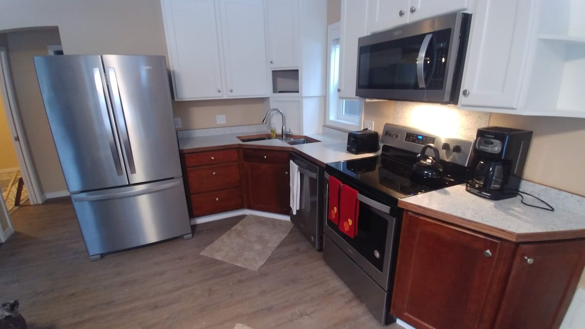 У цьому нещодавно побудованому помешканні є два ліжка queen-size в окремих кімнатах. У ньому є повністю обладнана кухня, пральна та сушильна машини, дві ванні кімнати (ванна нагорі, душ вниз). Надається інтернет і телевізор, а також розкладний диван, який являє собою матрац розміру «queen size» з піни з ефектом пам 'яті (американський шкіряний бренд), який дуже зручний для двох додаткових людей, що дозволяє шістьом людям залишатися комфортними. Крім того, якщо є потреба в дитячому ліжечку, його можна надати без додаткової плати.