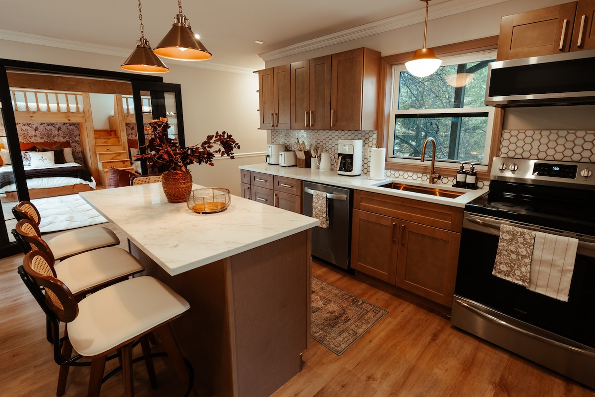 Красивий розкішний таунхаус для 8 гостей, з 2 спальнями, 2,5 ванними кімнатами, повністю обладнаною кухнею, кабінетом, лофтом та терасою з грилем з видом на паркову територію спільного користування. Яскраві інтер’єри, мансардні вікна, вид на гори та мармуровий душ захоплюють дух. Кроки від гори Шоні та коротка поїздка до Shawnee Inn & Golf, водоспаду Бушкілл, Делаверського водоспаду, аутлетів та ресторанів. Включає сніданок, закуски та якісні засоби для догляду за тілом – ідеально підходить для сімей, пар або груп. Доступне оформлення.