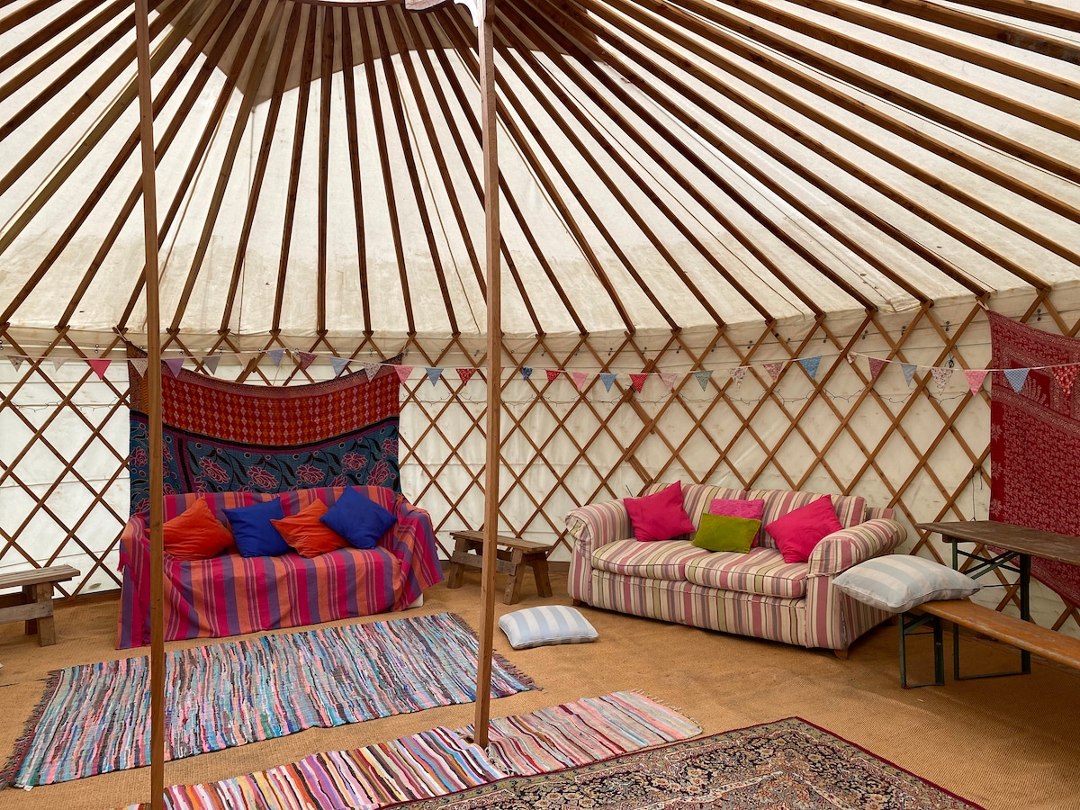 A beautiful yurt in an idyllic setting, our Bluebell. Relax and unwind in a hidden gem. The ground blanketed with Bluebells throughout April and some of May. Comfortably sleeps 4 with a lovely double bed and pull out two futons. There is a shelter with seating, lighting, bbq and drinking water. There is also a rustic firepit. There is a shared kitchen and toilet/shower block up at the farm for guests to use. Bedding is provided but please bring your own towels. Relaxation is gaurenteed