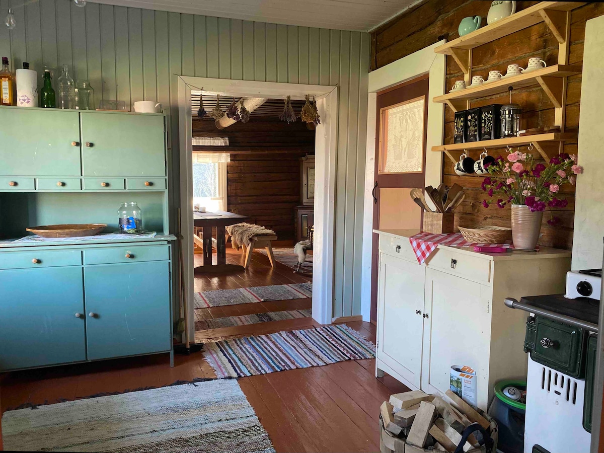 Our piece of land is located on Kaita Järvi– an about 8 km long and a few hundred meter wide lake – it is a small peninsula that looks to the south. That means: sun from morning to evening (if it shines). There right on the shore you find our log cabin, with sauna, bathroom, living room with open kitchen and two small bedrooms. A few meters next to it is a studio like guesthouse, the "Aita". It is also very cosy and comfortable, but provides no own bathroom. Village Savonranta is 5 km away.