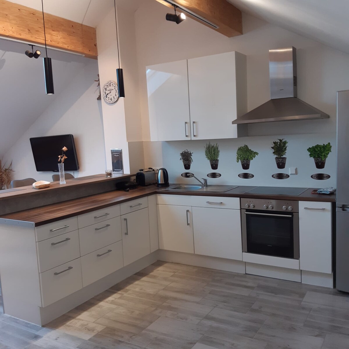 Розслабтеся в цьому особливому та тихому місці. На горищі на третьому поверсі є 2 спальні, 1 вітальня та їдальня, кухня та ванна кімната. Будинок є новою будівлею і відповідно інтер 'єр виконаний у яскравих та доброзичливих кольорах. Квартира знаходиться в тихому місці та має прекрасний краєвид на сільську місцевість, де можна відпочити від повсякденного життя. Обладнання: підлогове опалення, повний SFK вкл. Посуд тощо, душова кабіна, вікна від підлоги до стелі у вітальні та їдальні.