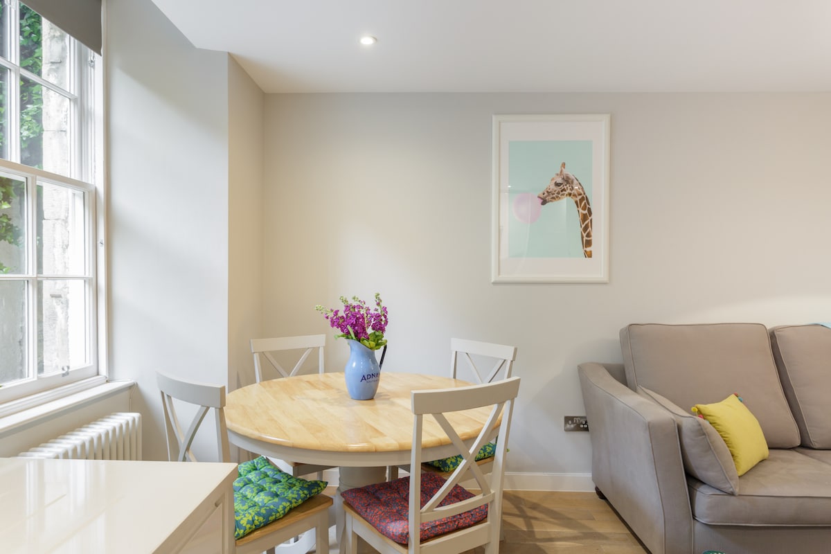 Цей чарівний будинок Mews - ідеальне місце для вашого перебування в Единбурзі. Прихований на мирній бруковій провулку, ви можете уникнути міського хаба та відпочити. У сонячний день можна посидіти за ранковою кавою або, можливо, випити келих вина ввечері! Вона розташована в центрі нового міста, всього в декількох хвилинах ходьби від площі Сент-Ендрюс і нового центру Сент-Джеймс. Насолоджуйтеся гулом міста від спокою цього помешкання