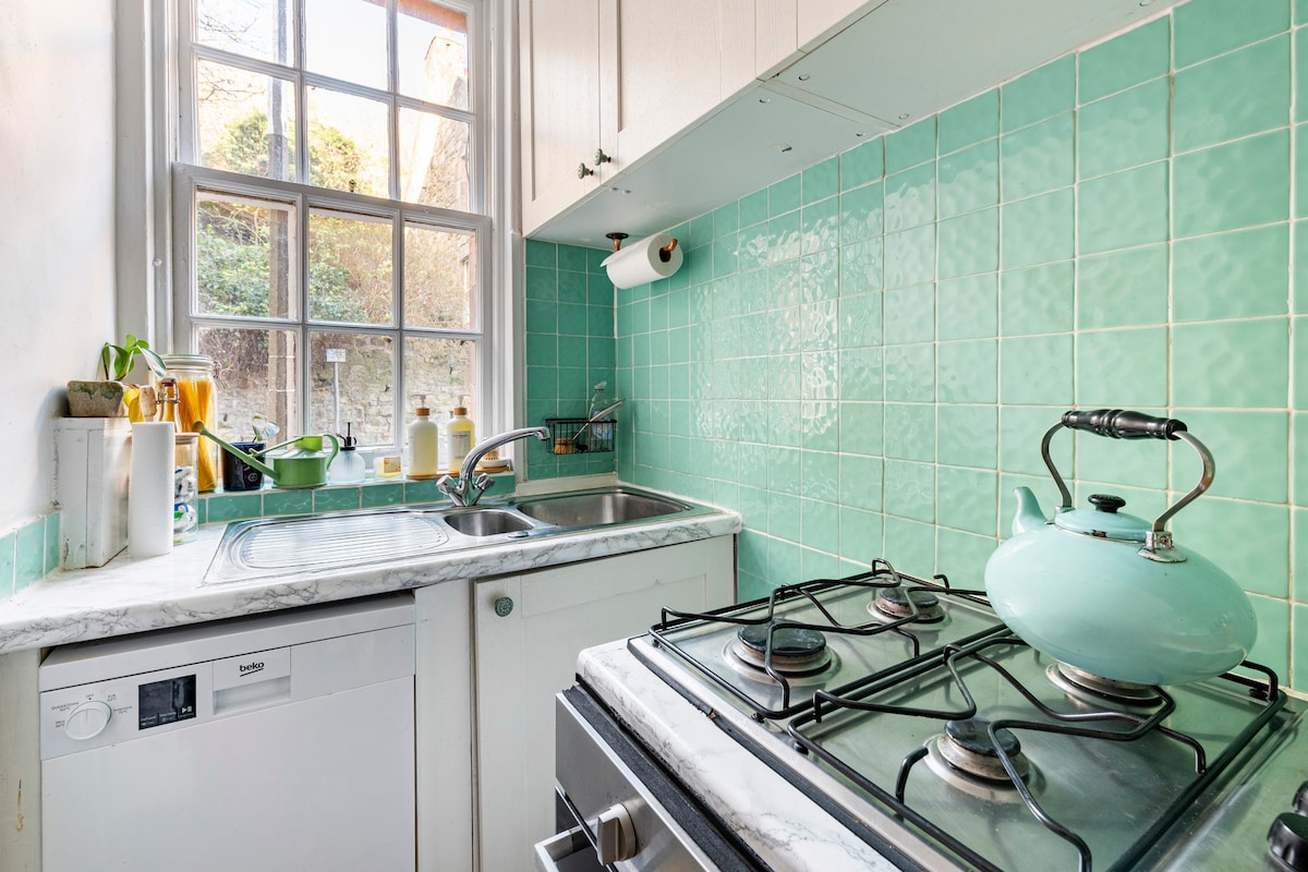 Затишна, світла квартира в Лейті, ідеально підходить для мандрівників, які подорожують наодинці, або пар. Вікна, що виходять на захід, відкривають чудові заходи сонця. Насолоджуйтеся добре облаштованою кухнею, зручною вітальнею з диваном-ліжком, дров'яною піччю, проєктором та затишною спальнею. Невелика ванна кімната з ванною для однієї людини. Тихий район, 5 хвилин пішки до трамваю, поруч кафе, магазини та парк, де можна гуляти з собаками. Доступ до спільного саду. Ідеальна база в Единбурзі!