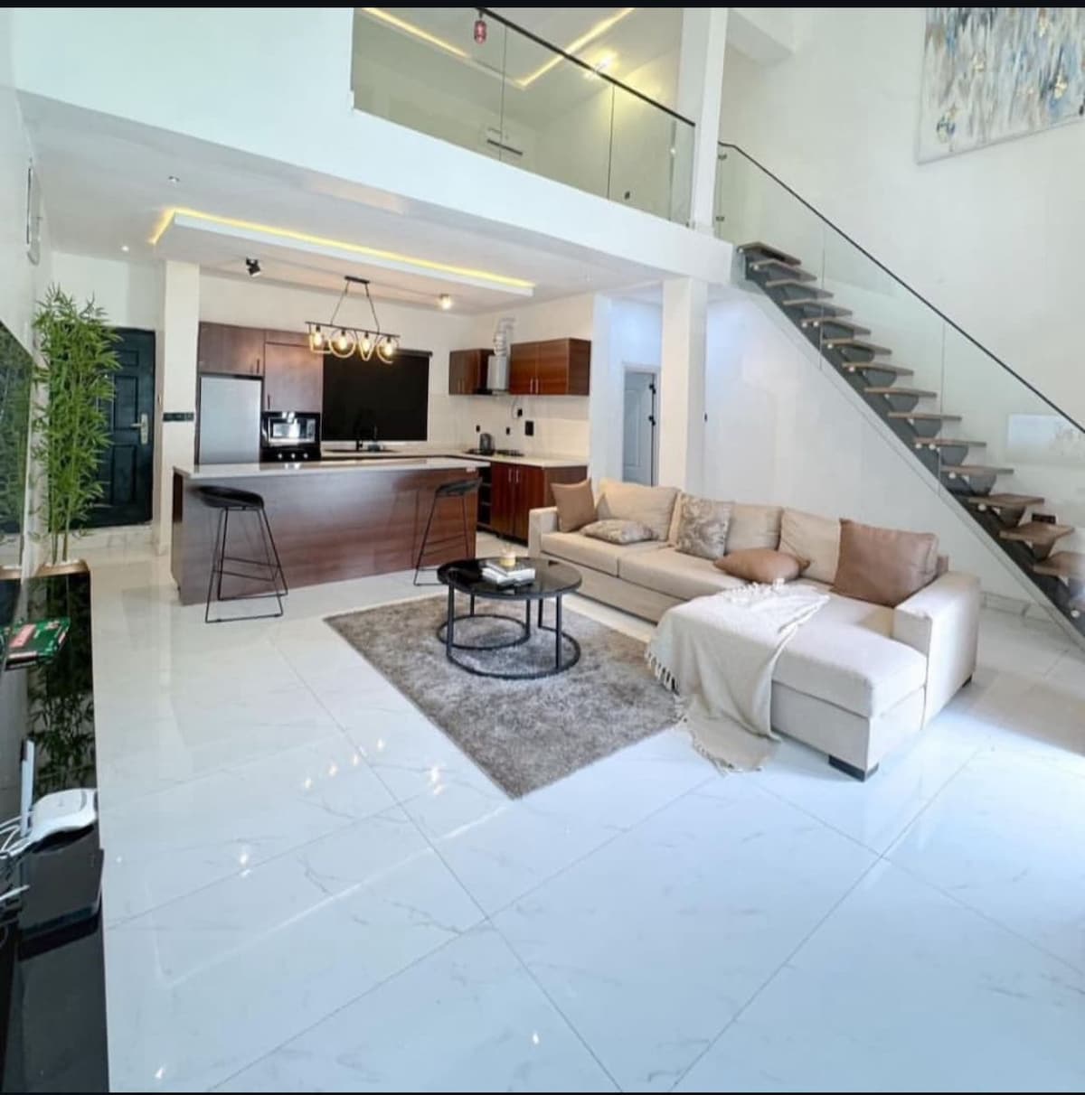Have fun with the whole family at this stylish three bed ensuit apartment, with outdoor beachstyle relaxation area, outdoor bar, outdoor stage area for comfort, 24hrs power supply, cctv around the full premises, ac in all bedrooms and elegant interior design of the apartment.