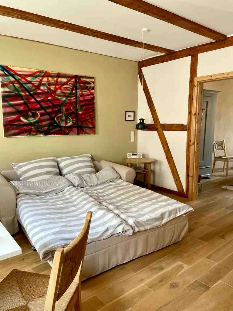 Lehne dich zurück und entspanne dich – in dieser ruhigen,stilvollen Unterkunft mit Wohnzimmer, Schlafzimmer, Durchgangsküche und einem Badezimmer mit Dusche. Im Wohnzimmer steht ein 140cm breites Schlafsofa für 1-2 Personen,bei Bedarf kann noch ein Kinderreisebett zur Verfügung gestellt werden. Durch die lehmverputzten Wände herrscht ein wunderbares Wohnklima, mit viel Liebe zum Detail möchten wir, dass es Dir hier gut geht!Es ist alles frisch saniert und wartet darauf, Dich glücklich zu machen.