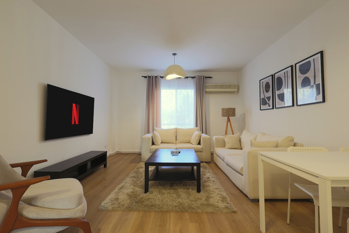 Відпочиньте та насолодіться перебуванням у цій стильній квартирі з 2 спальнями на першому поверсі з приватним садом у Stone Residence, Новий Каїр. Ідеально підходить для сімей або ділових поїздок, з прямим доступом до зелених насаджень, басейнів і безпечного закритого комплексу всього за кілька хвилин від Cairo Festival City. Переваги: - Перший поверх з приватним садом і патіо – сучасні інтер’єри, які підійдуть для сімей; - Закритий комплекс із басейнами, зеленню, кафе та дитячими зонами - Цілодобова охорона та безкоштовні паркувальні місця - Високошвидкісний Wi-Fi.