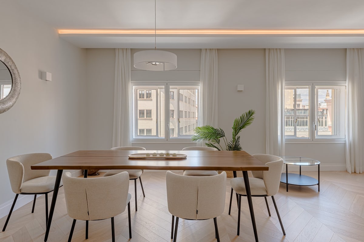 Ця квартира була красиво відремонтована. У ньому є 4 спальні та 3 ванні кімнати, а також додаткова гнучка кімната з двома двоспальними диванами-ліжками. З сучасної кухні, елегантної їдальні та балконів відкривається вид на площу Мера. Квартира надає рідкісну можливість зупинитися в одній з історичних будівель на площі мера Мадрида. Побудований на початку XVII століття і відреставрований у 1790 році, Плаза Мер розташована в центрі історичного центру міста.