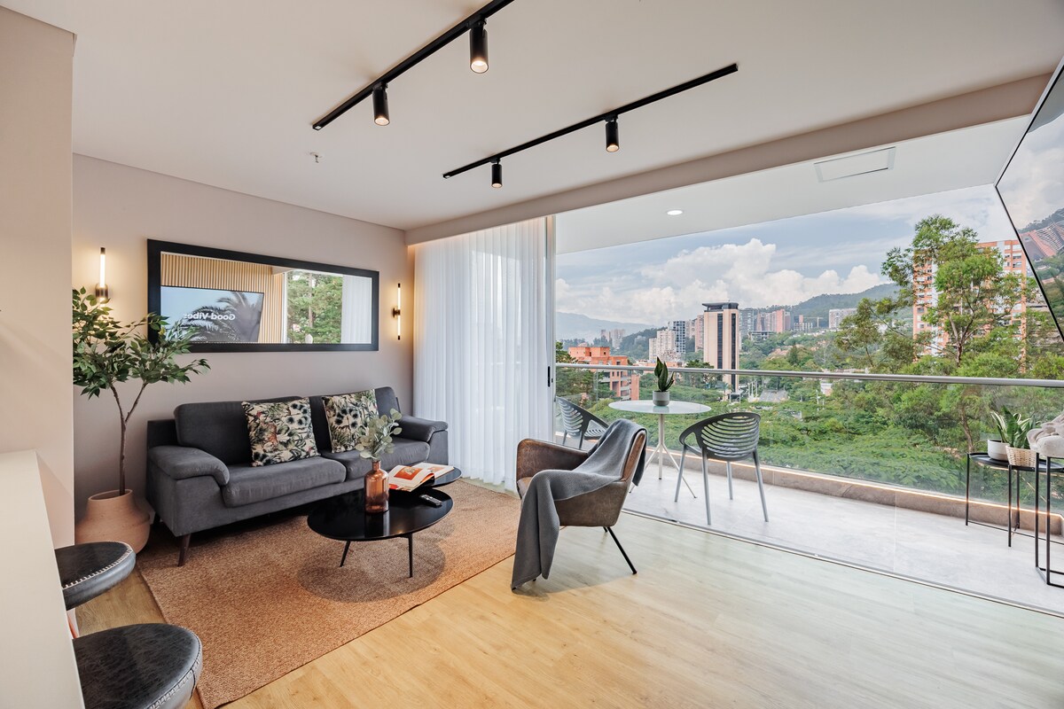 Елегантна квартира площею 104 кв. м (1120 кв. футів) з панорамним видом на Медельїн. До ваших послуг дві спальні з двоспальними ліжками розміру King size та окремими ванними кімнатами, гостьова ванна кімната, кондиціонер та простора приватна тераса. У будівлі є безкрайній басейн, коворкінг, тренажерний зал і повністю обладнана кухня для гастрономічних вражень. Розташований всього за 9 хвилин від Ель-Побладо, Провенси та Парку Льєрас. ✨ Простір, де дизайн поєднується з комфортом, а Медельїн стає вашою приватною сценою.