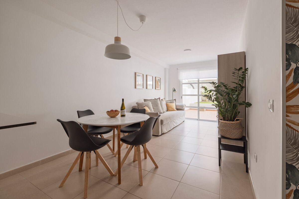 Coqueto apartamento cerca del aeropuerto, a solo 5 minutos en coche y 12 minutos caminando. Bien comunicado con la zona norte y sur de la isla. Recogida de llaves automatizada con código. Primer piso sin ascensor, totalmente equipado, con amplia terraza exterior privada y porche. Dormitorio con cama de matrimonio y sofá cama para dos personas. Esperamos su visita.
