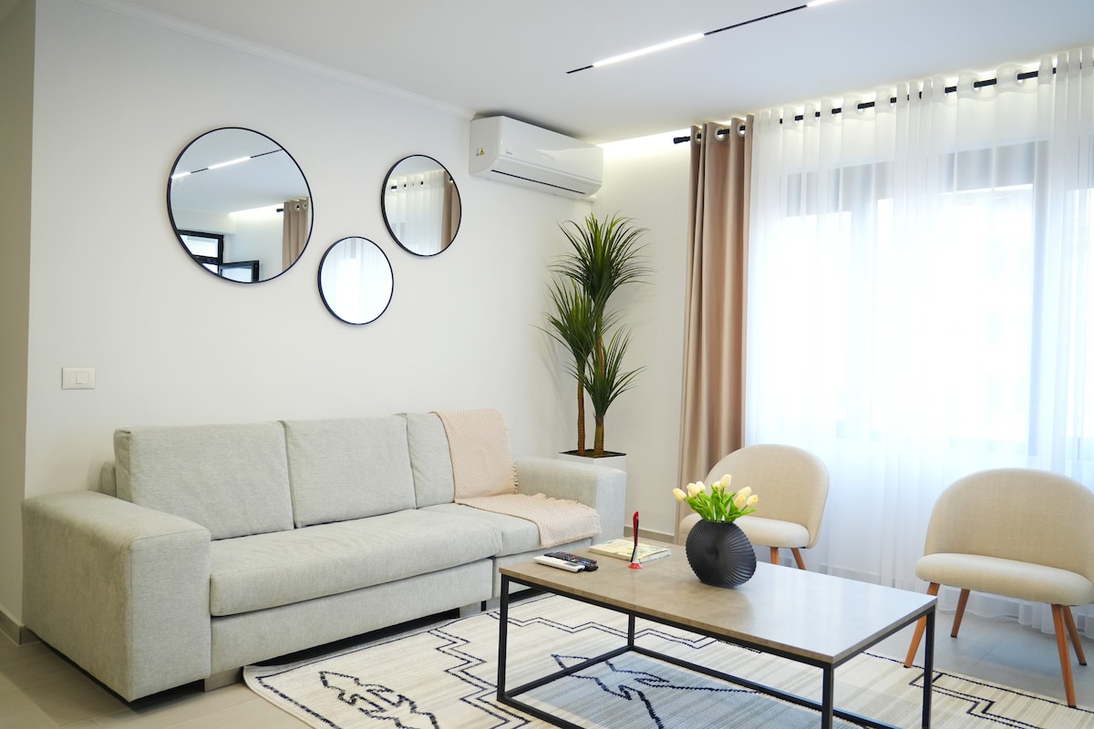 Ця затишна квартира площею 53 м² розташована в центрі Тирани, в 5 хвилинах ходьби від головних туристичних об 'єктів, центральних ділових та торгових центрів та району нічного життя. Він повністю меблюється ідеєю забезпечення відмінного комфорту для пари гостей. Однак чотирьох осіб можна розмістити, скориставшись двома диванами-кроватями у вітальні.