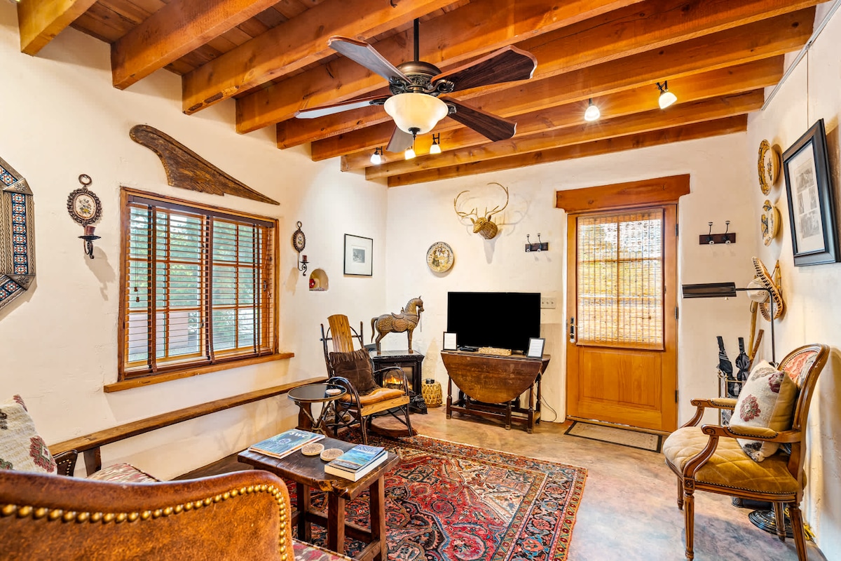 Відпочиньте й розслабтеся в цьому спокійному, затишному та автентичному помешканні Santa Fe Casita. Цей чарівний будиночок - гавань спокою та шарму. Розташований на 5 акрах безтурботного ландшафту, він пропонує затишний відпочинок із захоплюючим видом на навколишні гори. Цей затишний будиночок має красиво озеленений і огороджений подвір 'ям і ідеально підходить для тих, хто шукає приватний відпочинок, але залишається всього в декількох хвилинах їзди від яскравого серця історичного центру Санта-Фе!