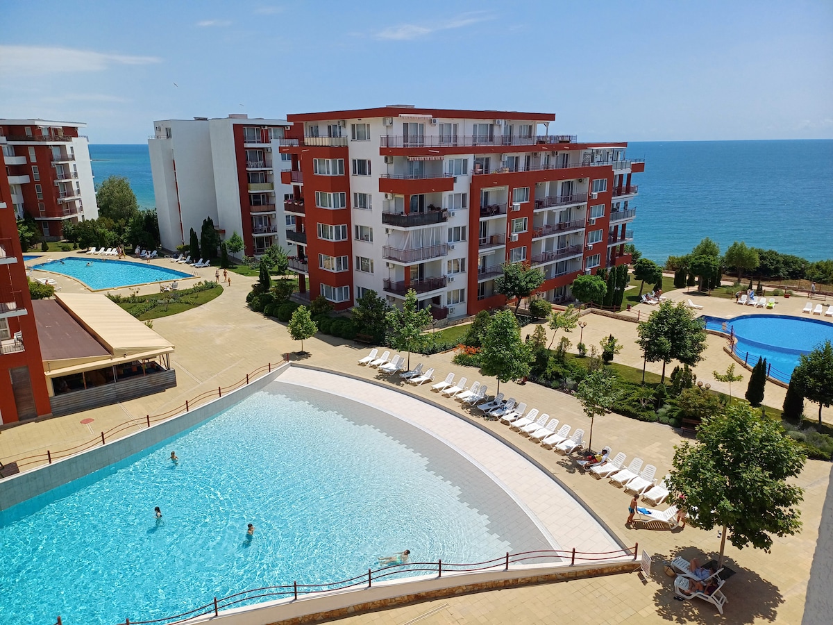 Затишна студія з Wi-Fi та кондиціонером! 🌴 У квартирі є Wi-Fi, кондиціонер, 2 ресторани, 2 магазини та доступ до садів із 17 відкритими басейнами. Район ідеально підходить для походів у гори Стара Планина, дайвінгу або міні-гольфу. Усередині ви знайдете кабельне телебачення та Netflix. На міні-кухні є мікрохвильова піч, холодильник, тостер, чайник та кавоварка, а у ванній кімнаті — пральна машина та фен.
