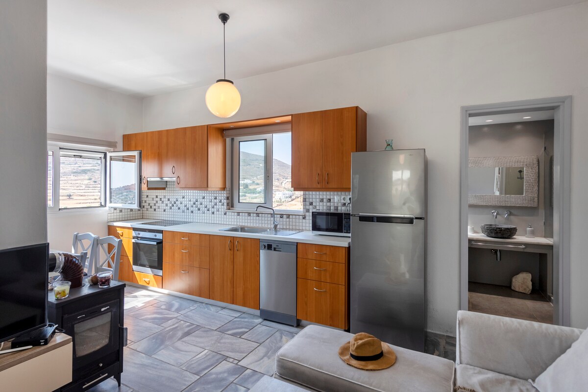 Open the sea-blue shutters and let in the cooling breeze, then whip up a snack at the urban concrete kitchen countertop at a breezy waterfront retreat. Step onto the spacious, leafy veranda for leisurely sunset drinks with unobstructed ocean views! The apartment is situated next to a sandy beach for a morning swim and a 2-minute walk from the center of Naousa and its main square. Shops, restaurants, bars, and clubs are within walking distance, yet the area is very quiet and calm!
