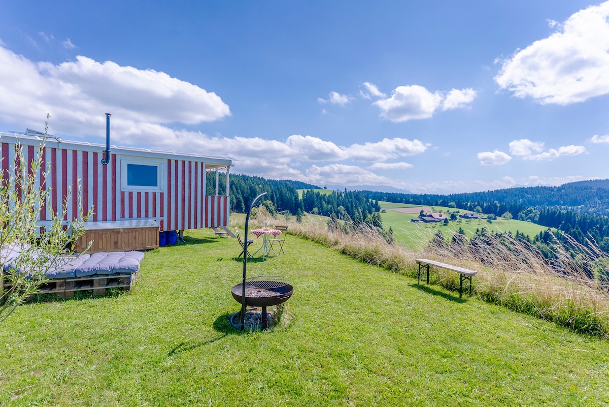 Zirkuswagen in der Natur mit traumhafter Aussicht