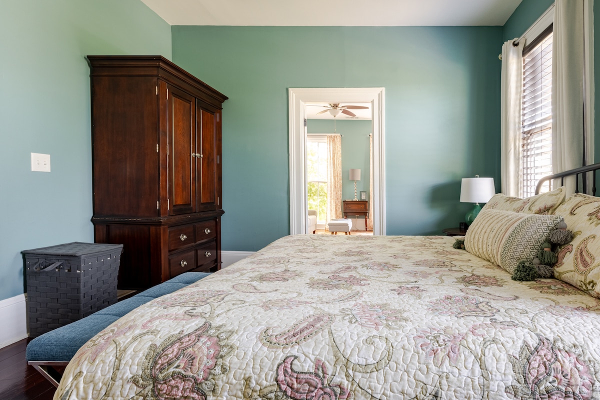Залишайтеся прямо в парку Форсайт — не «поруч» з ним, а справді в декількох кроках. Вийдіть за двері, перейдіть вулицю, і ви миттєво опинитеся в Ароматному саду, а культовий фонтан Форсайт знаходиться лише за один квартал. Ця романтична вікторіанська студія побудована приблизно в 1898 році. Вона має 12-футові стелі, красиві підлоги з соснового дерева та ліжко king size з балдахіном (Tuft & Needle), призначене для мрійливих вечорів у Саванні. Насолоджуйтеся затемнювальними шторами, повноцінною ванною з ванною/душем, затишною повноцінною кухнею та невеликим футоном для третього гостя