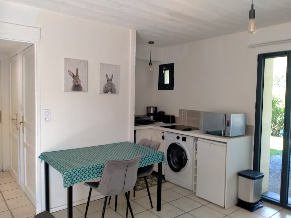 Незалежна студія площею 26 кв. м з окремою спальною зоною в окремому будинку з терасою, що виходить на південь, на краю лісу. Кухня та підлога були повністю перероблені у квітні 2023 року. Для 2 людей, повністю обладнана (140 ліжок, пральна машина, посудомийна машина, холодильник з морозильною камерою, мікрохвильова піч, індукційні плити, Nespresso, пилосос Dyson, тостер, чайник, телевізор, Wi-Fi) 300 метрів від велосипедної доріжки, 2 км від озера Аннесі, 800 метрів від бази парапланеризму та центру села