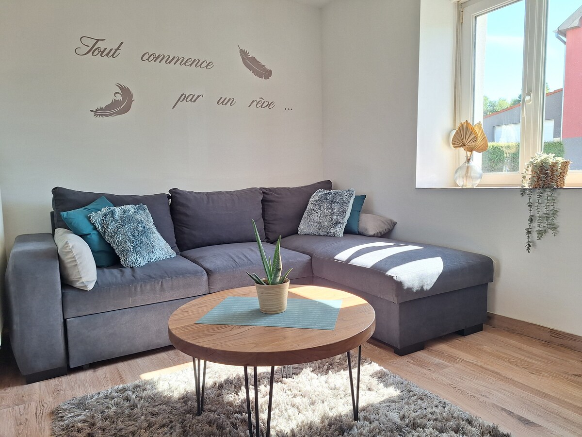 Ласкаво просимо до вертепу вовка, будинок 1 Квартира площею 50 м2 відремонтована в 2020 році, мебльована та обладнана усім необхідним для того, щоб ваше перебування було вдома. Розташоване в тихому та спокійному місці. Доступ є автономним з терасою та приватною парковкою (парковка має відеоспостереження) Повністю обладнана кухня Лаунж - диван-ліжко 140/200, помаранчевий телевізор і Netflix включено Спальня 1 двоспальне ліжко 180/190 Обладнана ванна кімната: фен, рушники, рушники тощо.