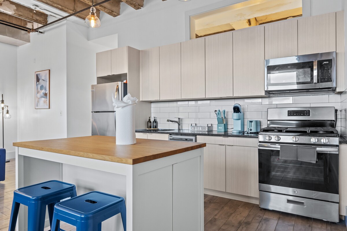 Ласкаво просимо до «The Lofts at Kearny» - розкішних лофтів Нью-Джерсі з індустріальною шикарною атмосферою та легким транзитом на Манхеттені! Це просторе помешкання, де можна перебувати з домашніми тваринами, має високі стелі, відкриту цеглу, планування мезоніну та дві привабливі спальні (з великим двоспальним ліжком і двома близнюками). Насолоджуйтеся світлим житловим простором із сучасними меблями, робочим місцем, високошвидкісним Wi-Fi та повністю обладнаною кухнею. Зручності включають пральну/сушильну машину в помешканні, безкоштовну парковку, спортзал і гриль на відкритому повітрі - ідеальний варіант для тривалого перебування.