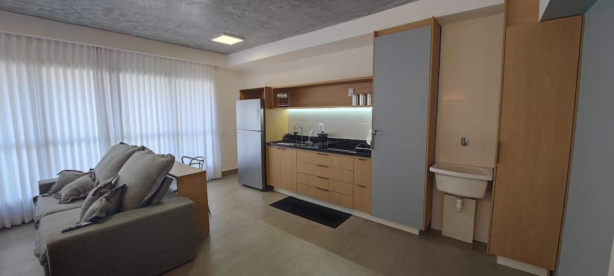 Сучасна та затишна розкішна студія з власним балконом, кондиціонером, пивоварнею, розташована в одному з найбажаніших регіонів Гоянії. Помешкання розташоване неподалік від торгового центру Flamboyant і стадіону Serra Dourada, що робить його зручним для тих, хто приїжджає для відпочинку та ділових поїздок. У комплексі є фітнес-центр, басейн, міні-маркет. На першому поверсі також розташований торговий центр з кафе та ресторанами. Розташування стратегічне, поруч із магазинами, розвагами та місцями проведення заходів.