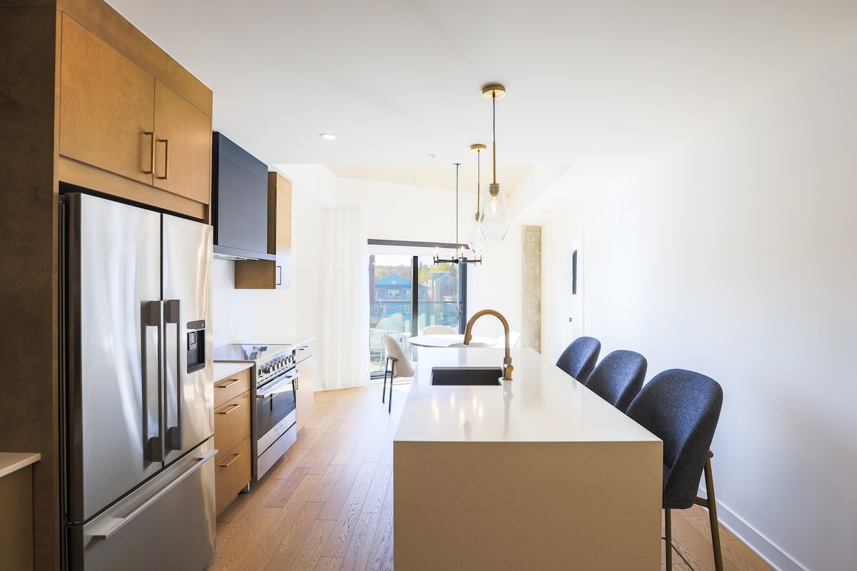 Suite 1 chambre moderne comprenant une cuisine complète, un salon avec foyer et un balcon privé. Profitez d’une vue sur le lac et les montagnes dans un cadre élégant, parfait pour un séjour relaxant. Les chiens NE sont PAS acceptés dans cette suite. Les chiens sont permis seulement dans les suites du 1er et 2e étages. Vous serez à proximité immédiate des restaurants, cafés et activités du centre-ville.