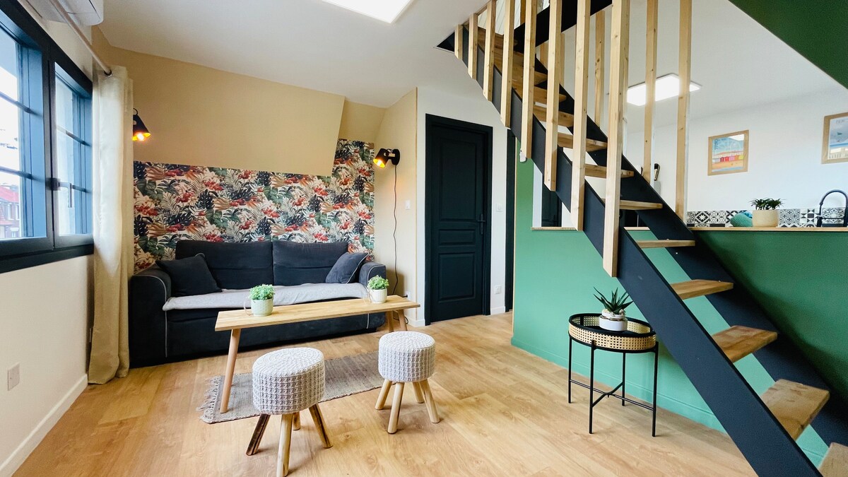 Appartement Indépendant, au second étage d'une MAISON PARTICULIERE. En hyper centre ville, à proximité immédiate des commerces , il est à 5 min à pied de la gare d'Etaples-Le Touquet. Le Touquet est accessible en vélo (15min), en voiture 9min. Vous disposerez de tous les équipements nécessaires au quotidien (y compris lave-vaisselle et lave-linge). Le linge de maison est fourni ainsi que les produits de base en entretien et consommation. Le thé et le café sont offerts mais pas le petit déjeuner