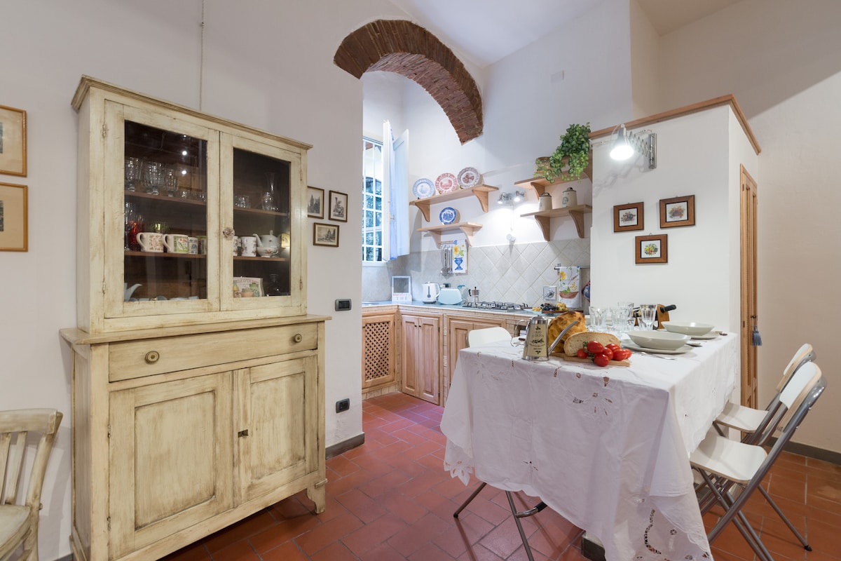 У житловому районі,за межами історичного центру, помешкання дрібно мебльоване та комфортне. Він має окремий вхід, є частиною тосканського фермерського будинку з мезонінними стелями та дерев 'яними балками. Він складається з вітальні/їдальні з двоспальним диваном-кроватью та сусідньої добре обладнаної кухні (холодильник,посудомийна машина та мікрохвильова піч). Двоспальна спальня розташована на мезоніні, до якого є зручна сходинка. Нижче розташовані шафи та шухляди. Дизайнерські меблі.