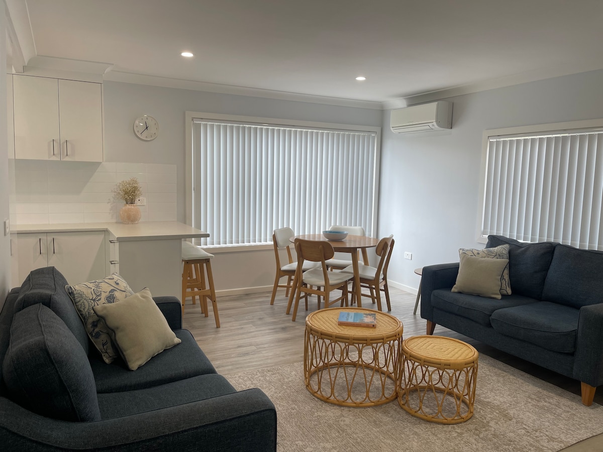 Наша дуже популярна повністю автономна квартира з 2 спальнями розташована в Вінг-Рок, Бейтманс-Бей, Новий Південний Уельс. Чудове розташування в тихому та рівному житловому районі, всього в 2 км від Батехавена та за 2,5 км до центру міста Батеманс-Бей, що робить його чудовим центральним розташуванням для прогулянок або поїздки до будь-якого місця призначення. Квартира обладнана усім необхідним для перебування на вихідних або тижнів. Завдяки повнорозмірній кухні та пральні у ванній кімнаті. Ми живемо на території та не потерпимо жодного порушення правил дому