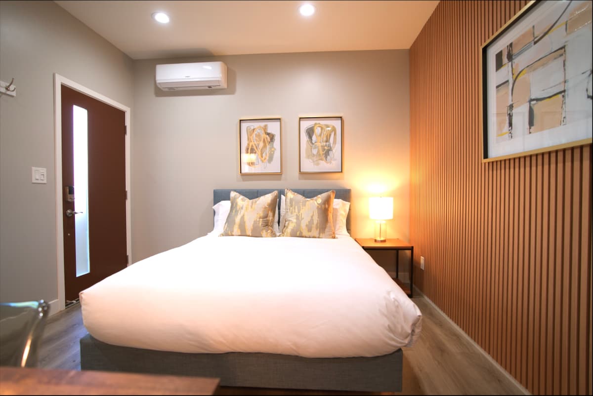 Цей люкс у Сан-Хосе, розташований наодинці, ідеально підходить для мандрівників наодинці або з домашніми тваринами. Спите як королівська особа на ліжку queen-size, починайте день з Nespresso і насолоджуйтеся міні-холодильником, мікрохвильовою піччю та 43-дюймовим телевізором у вашому робочому місці. Побалуйте себе преміальними туалетно-косметичними засобами, кондиціонером, а також феном і відпарювачем для полірованого вигляду. Легке самостійне прибуття/виїзд. Модна дерев 'яна панель додає стилю, створюючи ваш приватний кокон. Крім того, насолоджуйтеся приватним подвір 'ям, щоб відпочити й відчути вітер на відкритому повітрі.