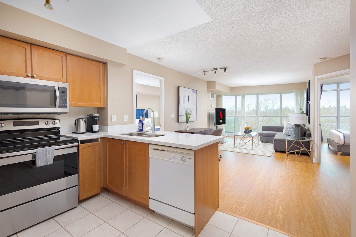 Experience downtown Toronto in a stylish condo! Start your day by enjoying coffee on the balcony. Walk to BMO Field (Toronto Stadium) - ideal for concerts, sports & FIFA events. Walk to CN Tower, Rogers Centre, Ripley’s Aquarium, Exhibition Place, restaurants & waterfront. Full kitchen, 2 desks with fast WIFI. Building features a pool, hot tub, sauna, gym, rooftop BBQ, free parking & self check-in. Discounts for 7+ nights & non-refundable bookings. Book your unforgettable Toronto stay today!