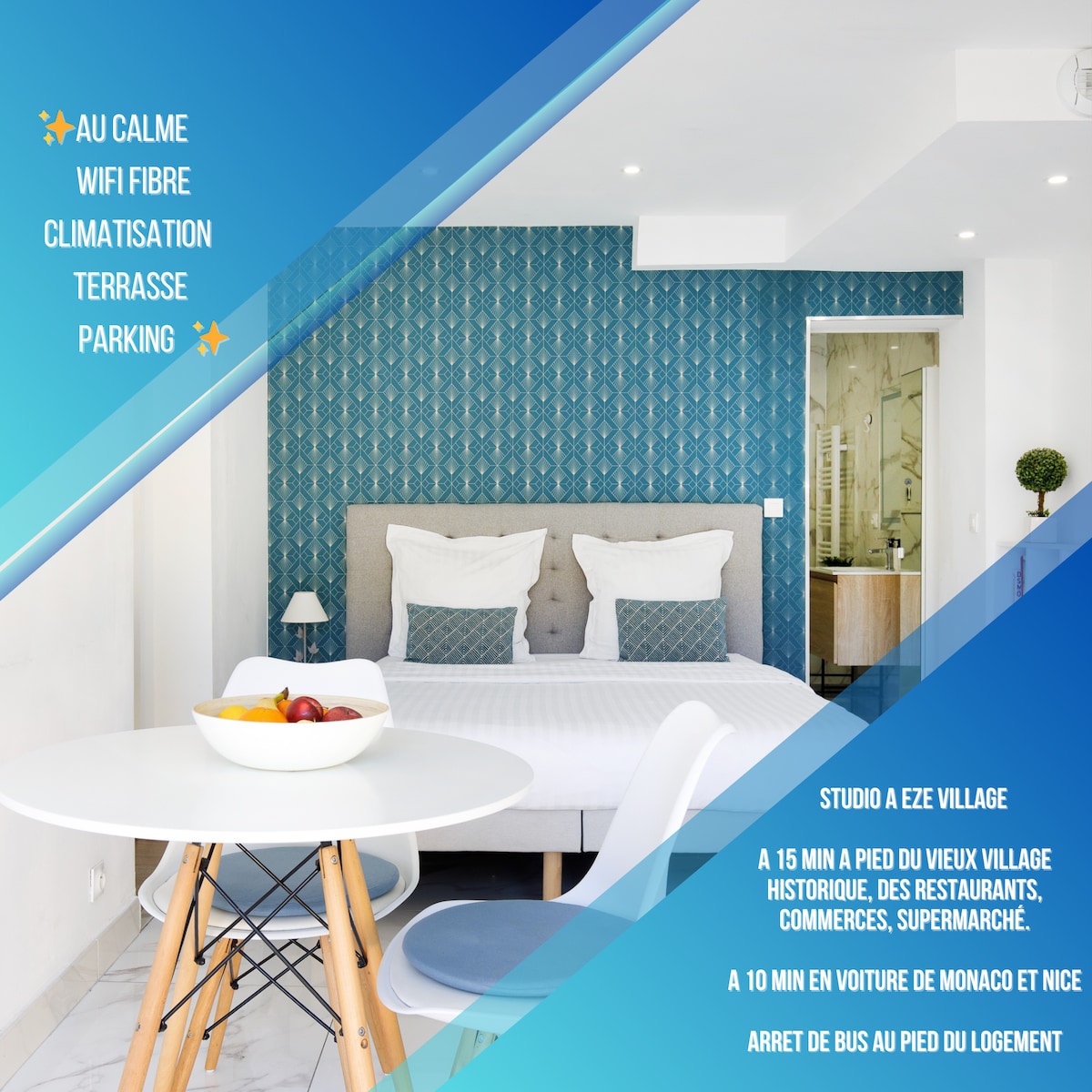 Будинок Ісидоре, розташований між Ніццо (15 км) і Монако (8 км), є частиною нашого будинку з окремим входом повністю незалежним. Дуплекс з кондиціонером містить повністю обладнану міні-кухню на першому поверсі. Перед входом невеликий стіл дозволяє їсти в відтінку гліцину. На верхньому поверсі є спальня та ванна кімната, до яких можна потрапити через невелику сходинку. Вікно бухти в спальні дає доступ до тераси з прекрасним видом на море бухти Езе.